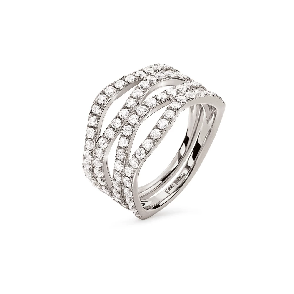 Ασημένιο 925° επιροδιωμένο φαρδύ δαχτυλίδι με λευκές κρυστάλλινες πέτρες από την συλλογή Fashionably Silver Temptation. Ταίριαξε το και με άλλα κοσμήματα της σειράς για ένα εντυπωσιακό αποτέλεσμα.