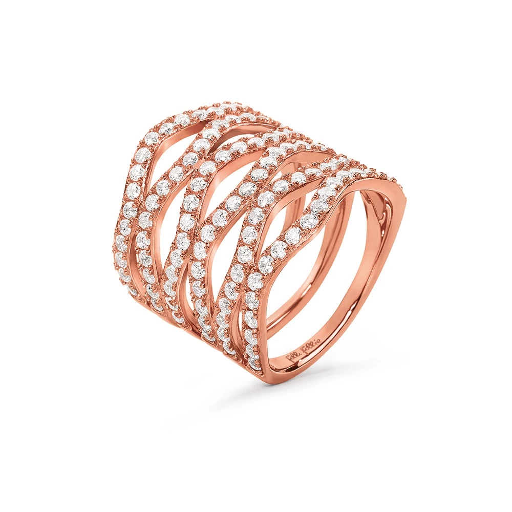 Ασημένιο 925° φαρδύ δαχτυλίδι με επιμετάλλωση σε ροζ χρυσό και λευκές κρυστάλλινες πέτρες από την συλλογή Fashionably Silver Temptation. Ένα δεν είναι ποτέ αρκετό, οπότε συνδύασε όσο πιο πολλά μπορείς και γίνε και εσύ μια fashionista.