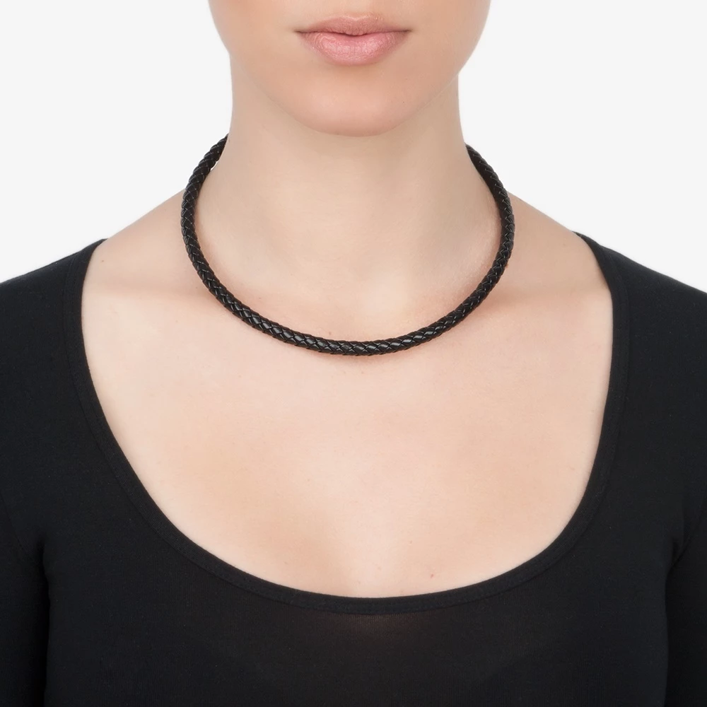 Κοντό choker κολιέ με μαύρο συνθετικό δέρμα από την συλλογή Match & Dazzle. Συνδύασε το με περισσότερα από ένα παντατίφ για ένα sporty chic look.