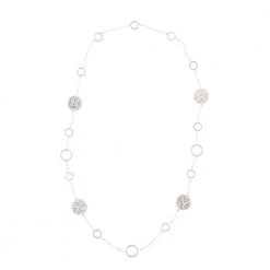 Επάργυρο κολιέ από τη συλλογή FIORISSIMO, με μακριά αλυσίδα, διακοσμημένη από κρίκους και στροφφυλά μοτίφ με τα χαρακτηριστικά λουλούδια της συλλογής. Κομψή επιλογή για τις εμφανίσεις από το πρωί μέχρι στο βράδυ.
