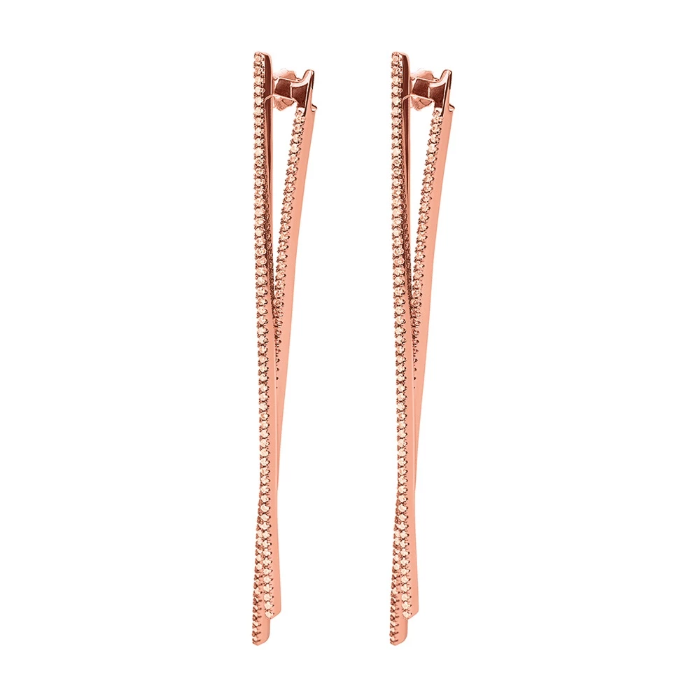 Γυναικεία κρεμαστά σκουλαρίκια FOLLI FOLLIE FASHIONABLY SILVER TEMPTATION από ασήμι 925° με επιμετάλλωση ροζ χρυσού. Δύο λεπτές βέργες διακοσμημένες με πέτρες ζιργκόν. Διαθέτουν κούμπωμα καρφάκι. Ένα κομψό κόσμημα που θα ολοκληρωσει τις πιο επίσημες εμφανίσεις σας.
