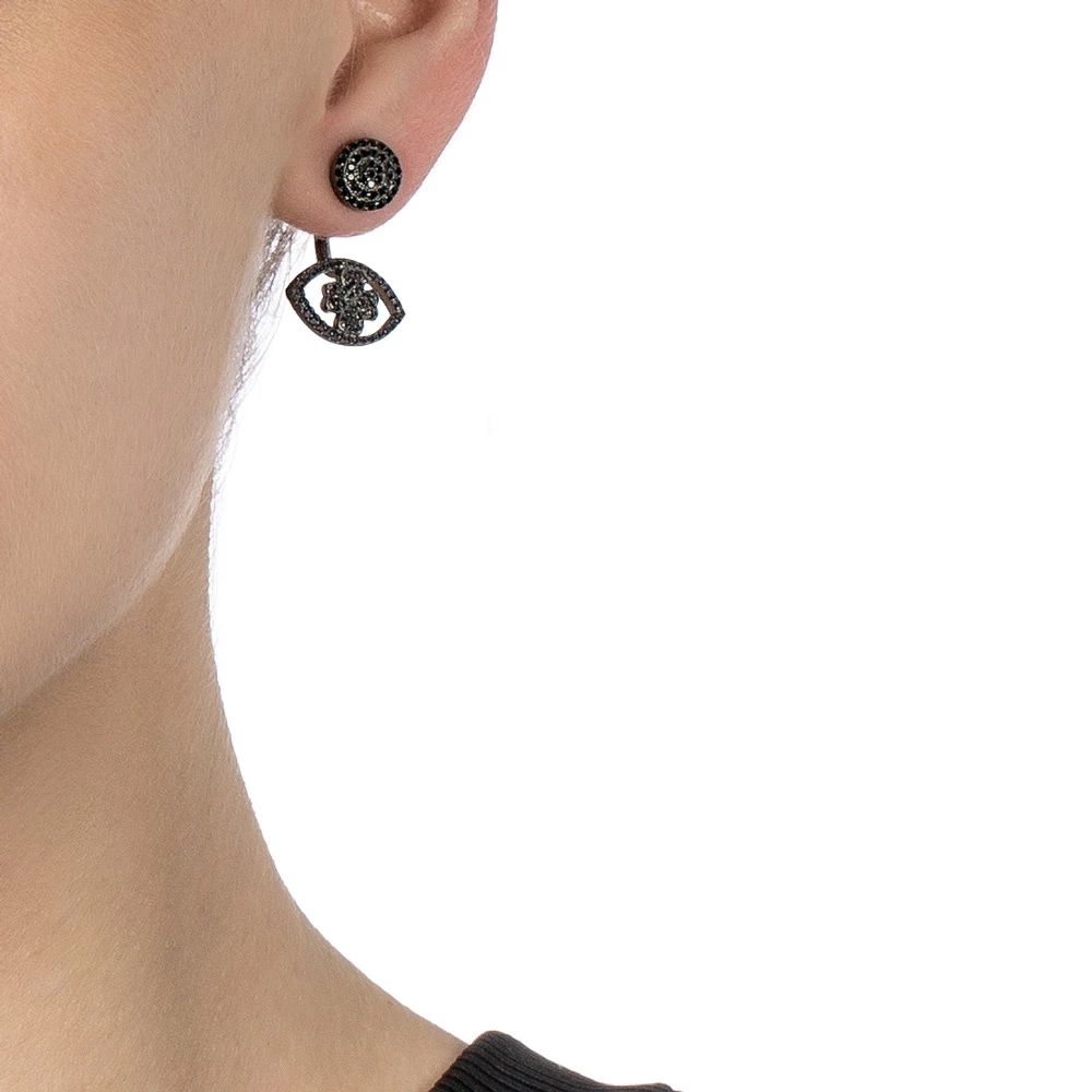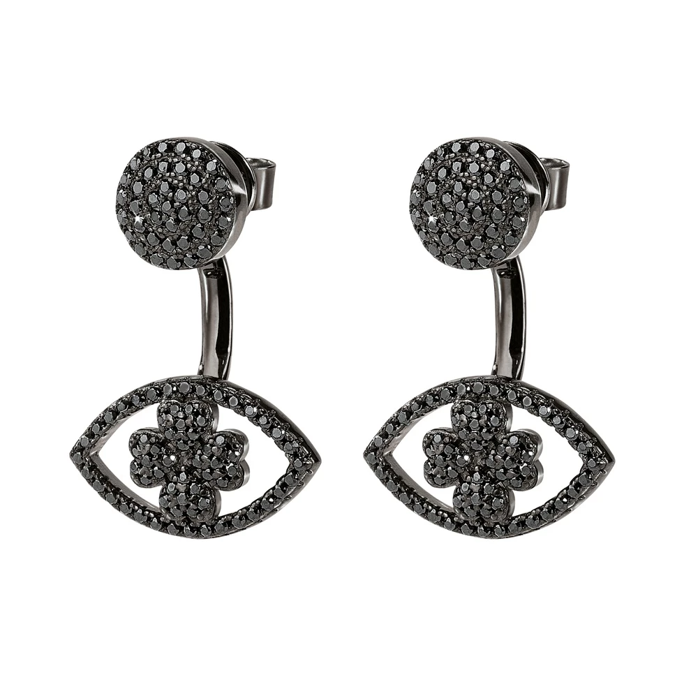 Γυναικεία σκουλαρίκια FOLLI FOLLIE HEART4HEART MATI από επιμεταλλωμένο μαύρο ασήμι 925°. Σχέδιο με τις χαρακτηριστικές τέσσερεις καρδιές μέσα σε περίγραμμα μάτι διακοσμημένα με πέτρες ζιργκόν και μικρή bowl που αφαιρείται και φοριούνται και μεμονωμένα. Διαθέτουν κούμπωμα καρφάκι. Ένα ιδιαίτερο κόσμημα, που θα ολοκληρωσει κάθε σας εμφάνιση.