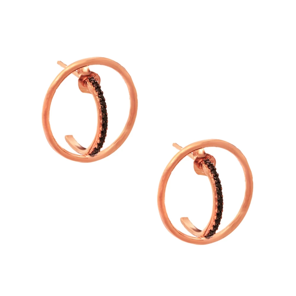 Γυναικεία σκουλαρίκια JEWELTUDE από ασήμι 925 με ροζ επιχρύσωση. Motif κύκλοι με κυρτές γραμμές, διακοσμημένες με μαύρα ζιργκόν και κούμπωμα καρφάκι. Με minimal αισθητική θα ολοκληρώσουν κάθε σας σύνολο.