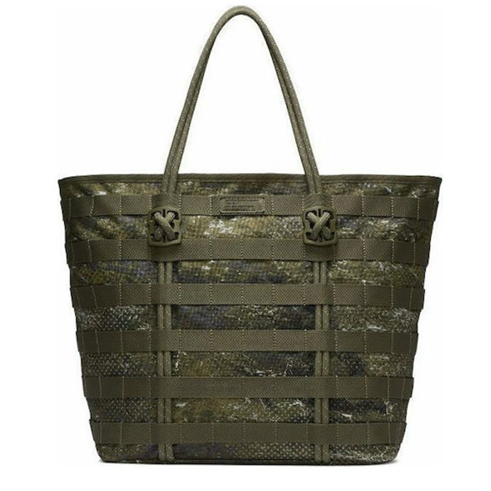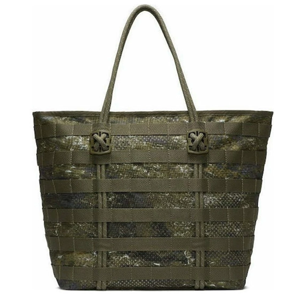 Γυναικεία αθλητική τσάντα ώμου NIKE AF-1 TOTE με πράσινο μοτίβο παραλλαγής. Από ανθεκτικό ύφασμα για να μεταφέρετε με ασφάλεια τον εξοπλισμό σας. Διαθέτει μία ευρύχωρη κύρια θήκη, μία εσωτερική τσέπη που κλείνει με κουμπί και δύο μικρότερες θήκες. Κλείνει με φερμουάρ στο επάνω μέρος.