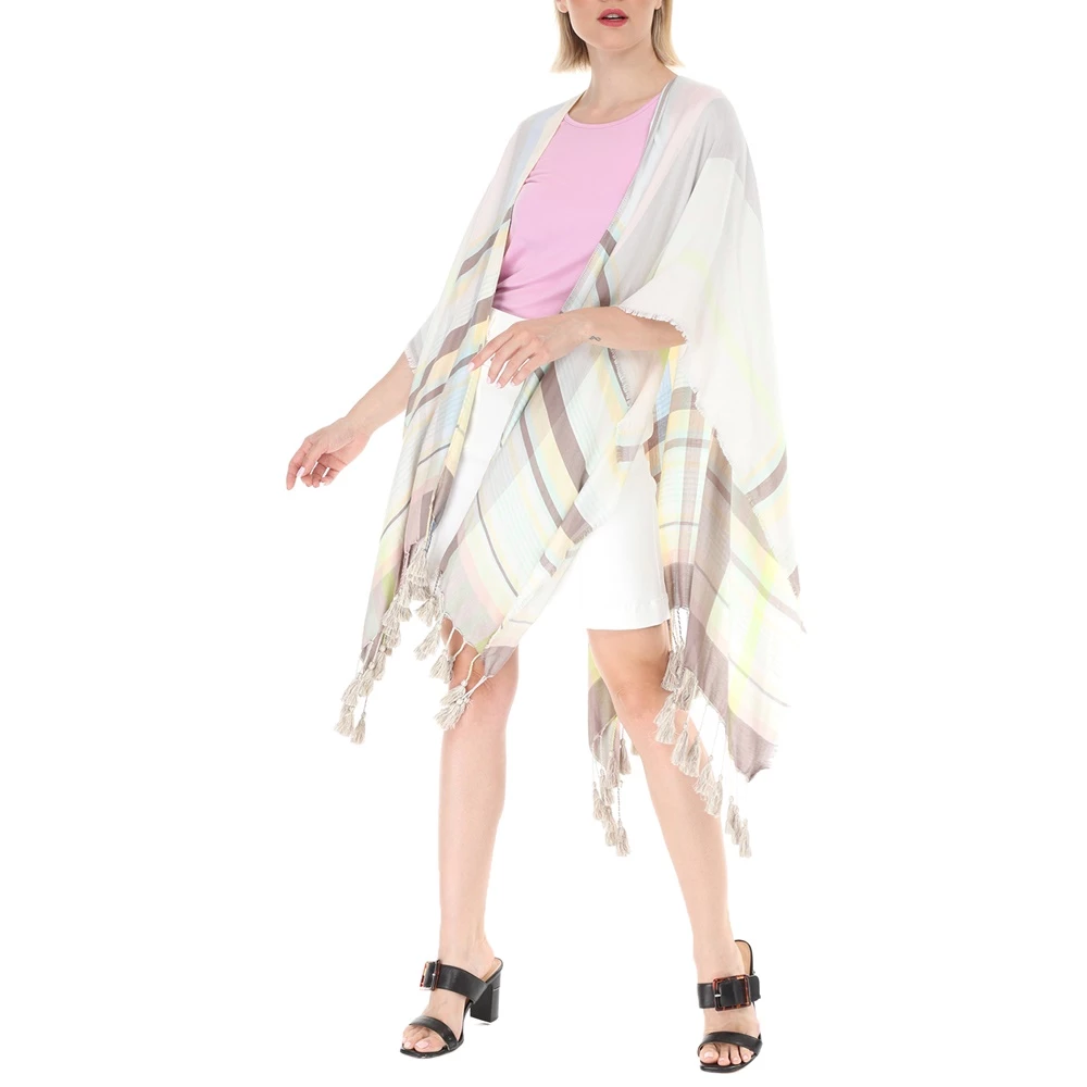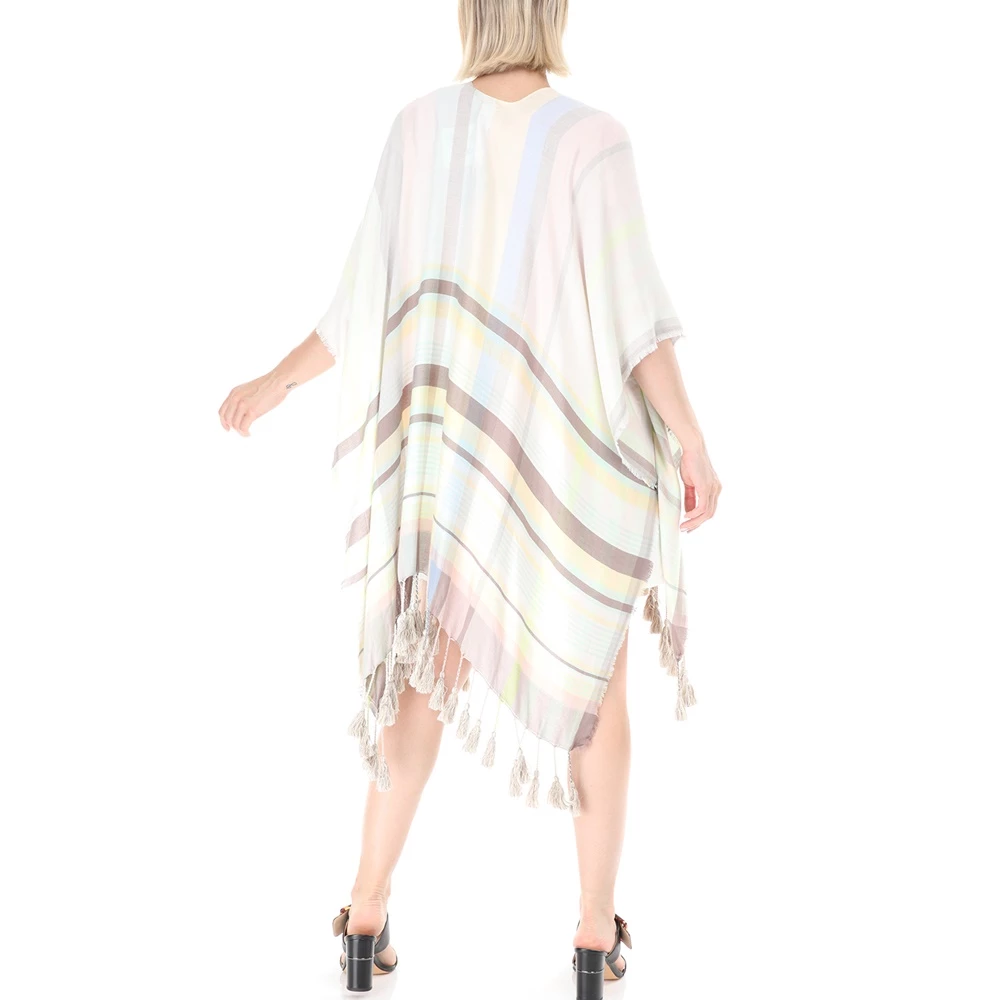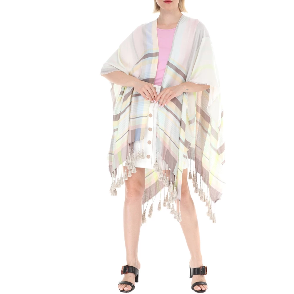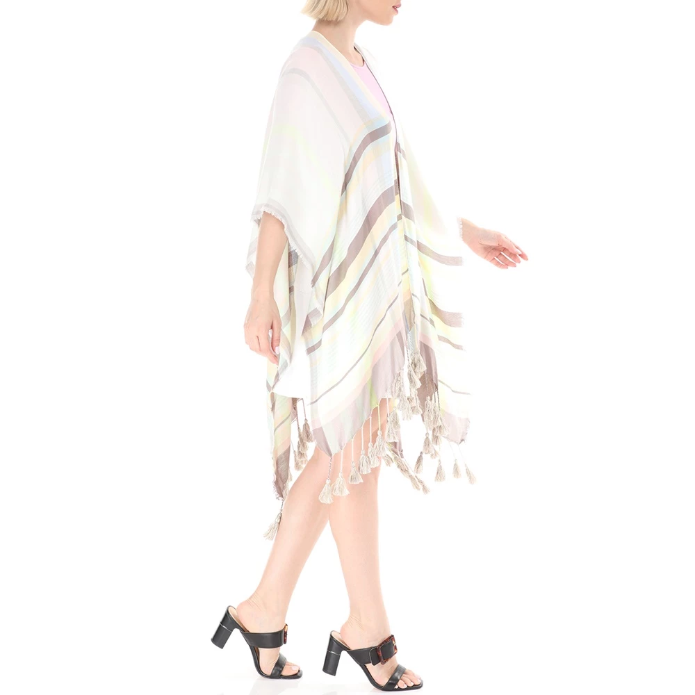 Γυναικεία εσάρπα με ριγέ μοτίβο σε γαλάζια, μπεζ, λευκή και κίτρινη απόχρωση. Μπορέιτε να τη φορέσετε σαν κιμονό στην πόλη για urban chic look αλλά και πάνω από το μαγιό σας!