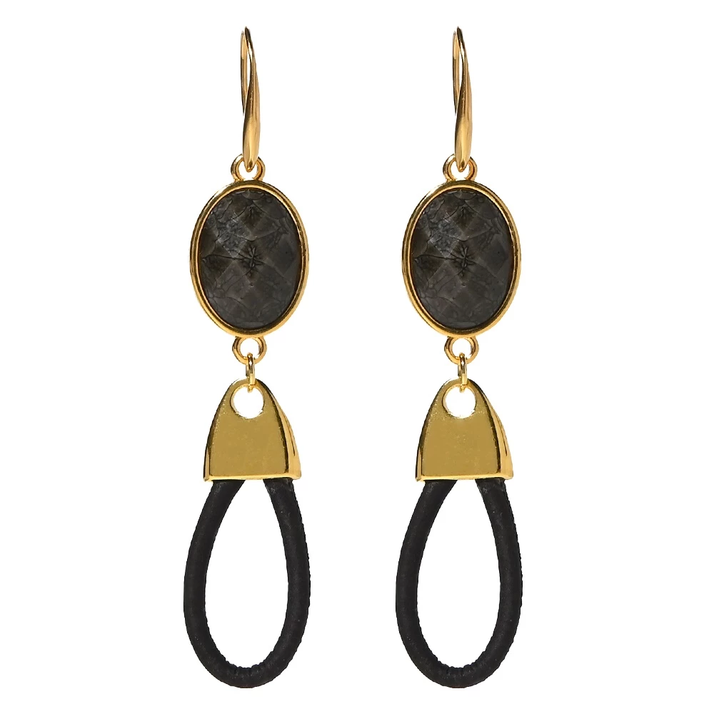 Γυναικεία κρεμαστά σκουλαρίκια APOXYLO. Είναι χειροποίητα και κατασκευασμένα από φυσικό φελλό σε μαύρο χρώμα, με επιχρυσωμένα μεταλλικά στοιχεία και διακοσμητικές μαύρες πέτρες από ακρυλικό υλικό. Συνοδεύονται από κουτί Apoxylo.