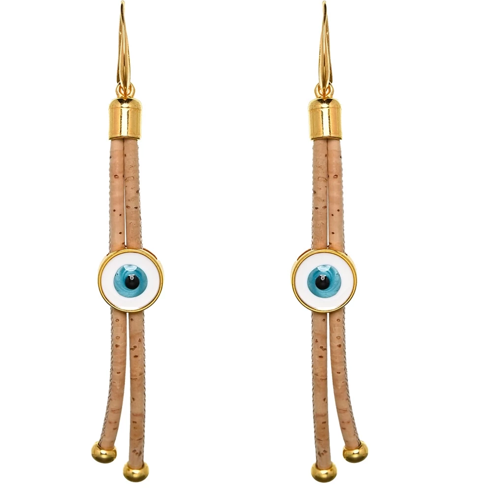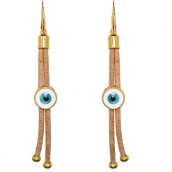 Γυναικεία κρεμαστά σκουλαρίκια APOXYLO. Είναι χειροποίητα και κατασκευασμένα από φυσικό φελλό, με επιχρυσωμένα μεταλλικά στοιχεία και διακοσμητικές κεραμικές πέτρες. Συνοδεύονται από κουτί Apoxylo.