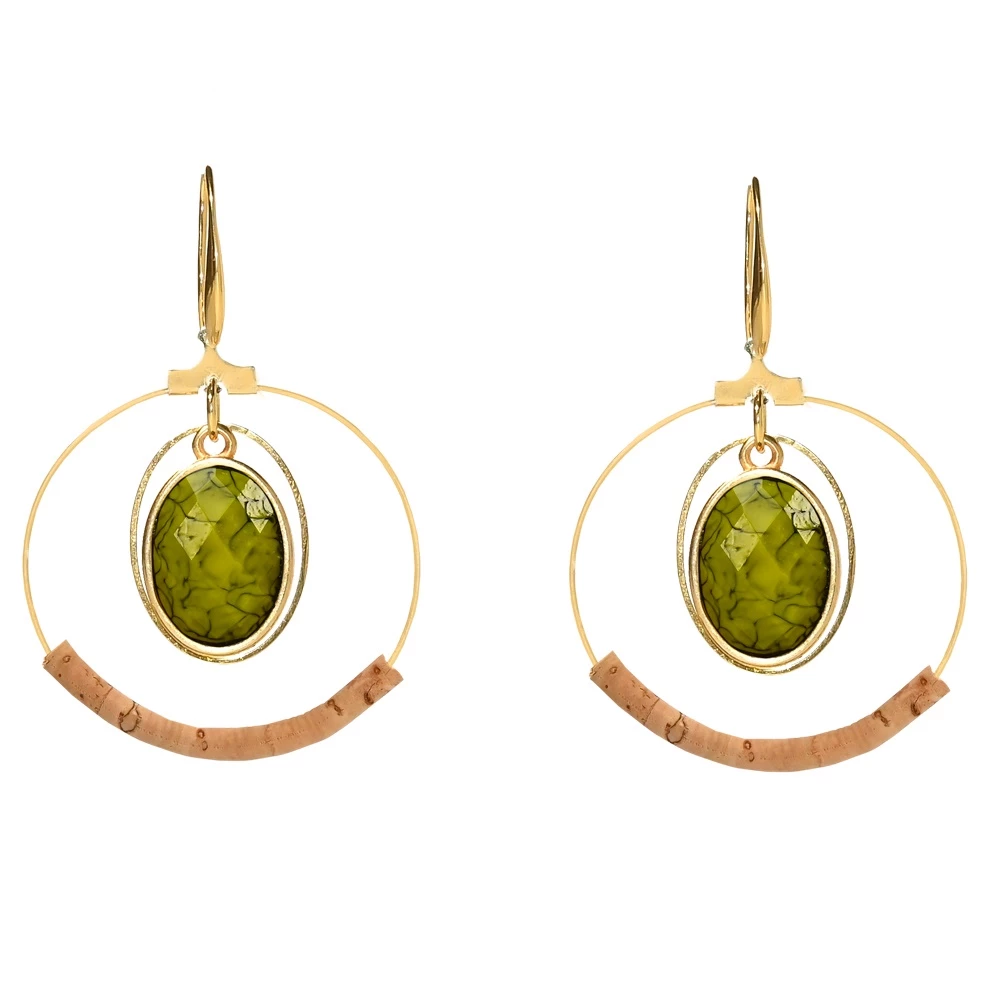 Γυναικεία κρεμαστά σκουλαρίκια APOXYLO σε σχήμα κρίκων, με επιχρυσωμένα μεταλλικά στοιχεία και δικοσμητική πράσινη ακρυλική πέτρα. Είναι χειροποίητα και κατασκευασμένα από φελλό. Συνοδεύονται από κουτί Apoxylo.