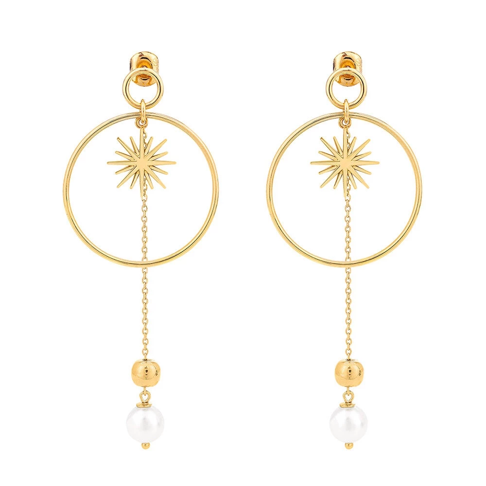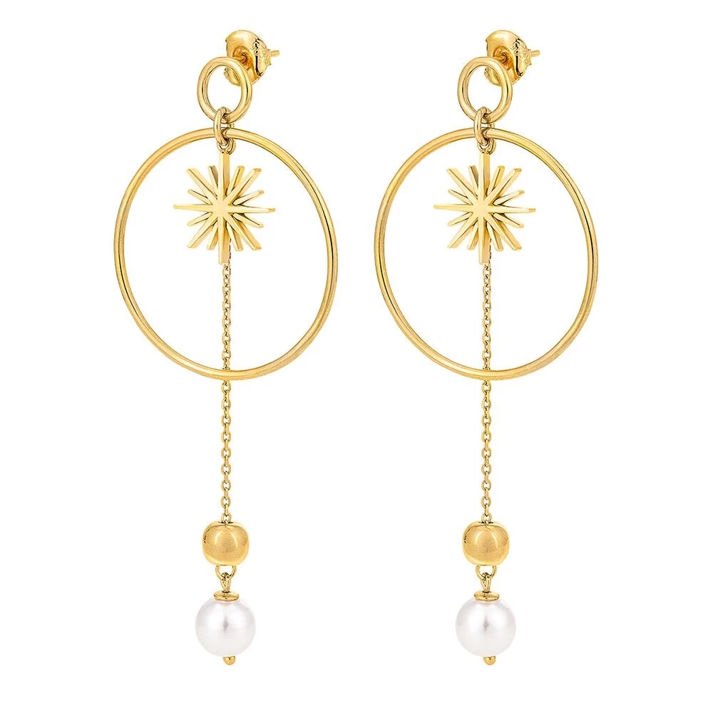 Γυναικεία μακριά σκουλαρίκια FOLLI FOLLIE από ασήμι 925 με κίτρινη επιχρύσωση 18k. Λεπτή αλυσίδα, κρίκοι, motif σε σχήμα ήλιου και μικρές λευκές πέρλες από την συλλογή Wishing On. Ιδανικά για πιο dressy εμφανίσεις που θα δημιουργήσουν ένα εντυπωσιακό look.