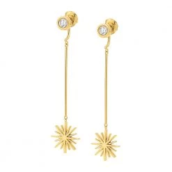Γυναικεία μακριά σκουλαρίκια FOLLI FOLLIE της συλλογής Wishing On Silver από ασήμι 925° με κίτρινη επιχρύσωση 18k. Καρφάκια με πέτρες ζιργκόν και αφαιρούμενη λεπτή βέργα, με μοτίφ σε σχήμα ήλιου. Φόρεσε το mini ζιργκόν μόνο του κατά την διάρκεια της μέρας και το μακρύ για μια νυχτερινή εξόρμηση.