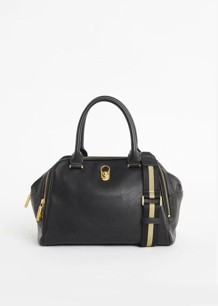 Γυναικεία τσάντα bowling GAUDI σε μαύρο χρώμα, με επαναλλαμβανόμενο μοτίβο το λογότυπο σε όλη την επιφάνεια. Από συνθετικό δέρμα, με δύο χειρολαβές και αποσπώμενο ιμάντα για να φοριέται και στον ώμο. Κλείνει με φερμουάρ.