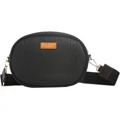 Γυναικεία τσάντα oval crossbody APOXYLO από φυσικό φελλό σε μαύρο χρώμα. Με επένδυση από βαμβακερό ύφασμα και αυξομειούμενο αφαιρούμενο ιμάντα.