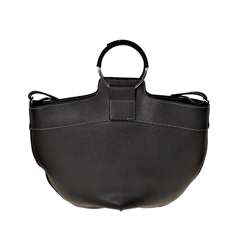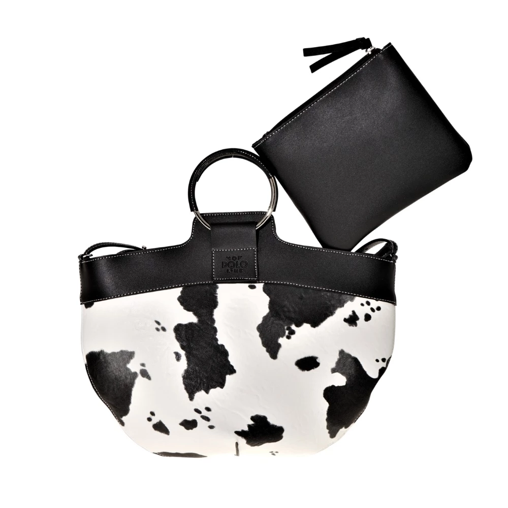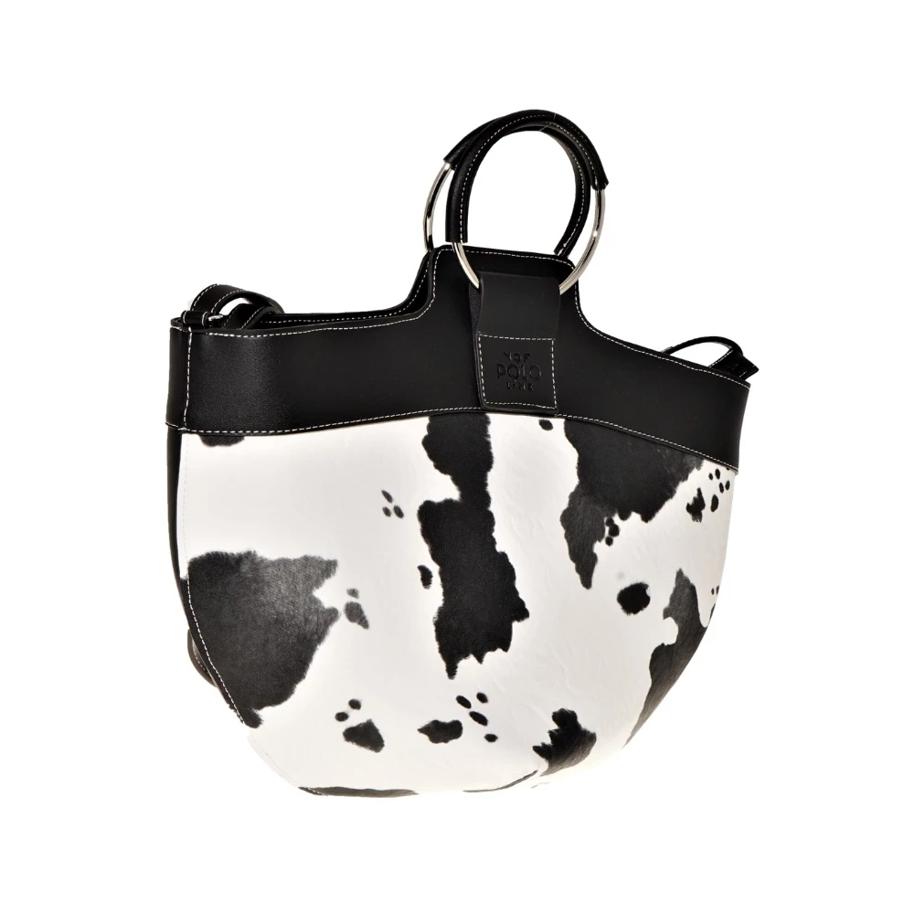 Γυναικεία τσάντα χειρός VQF POLO LINE σε μαύρο χρώμα, με λευκό animal print μοτίβο. Από οικολογικό δέρμα, με εντυπωσιακές χειρολαβές στο επάνω μέρος και ιμάντα για να φοριέται και στον ώμο. Διαθέτει αποσπώμενο πορτοφόλι και κλείνει με φερμουάρ.