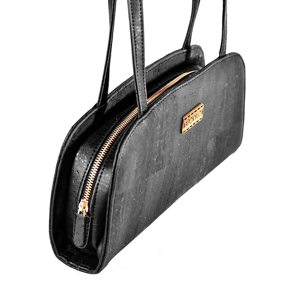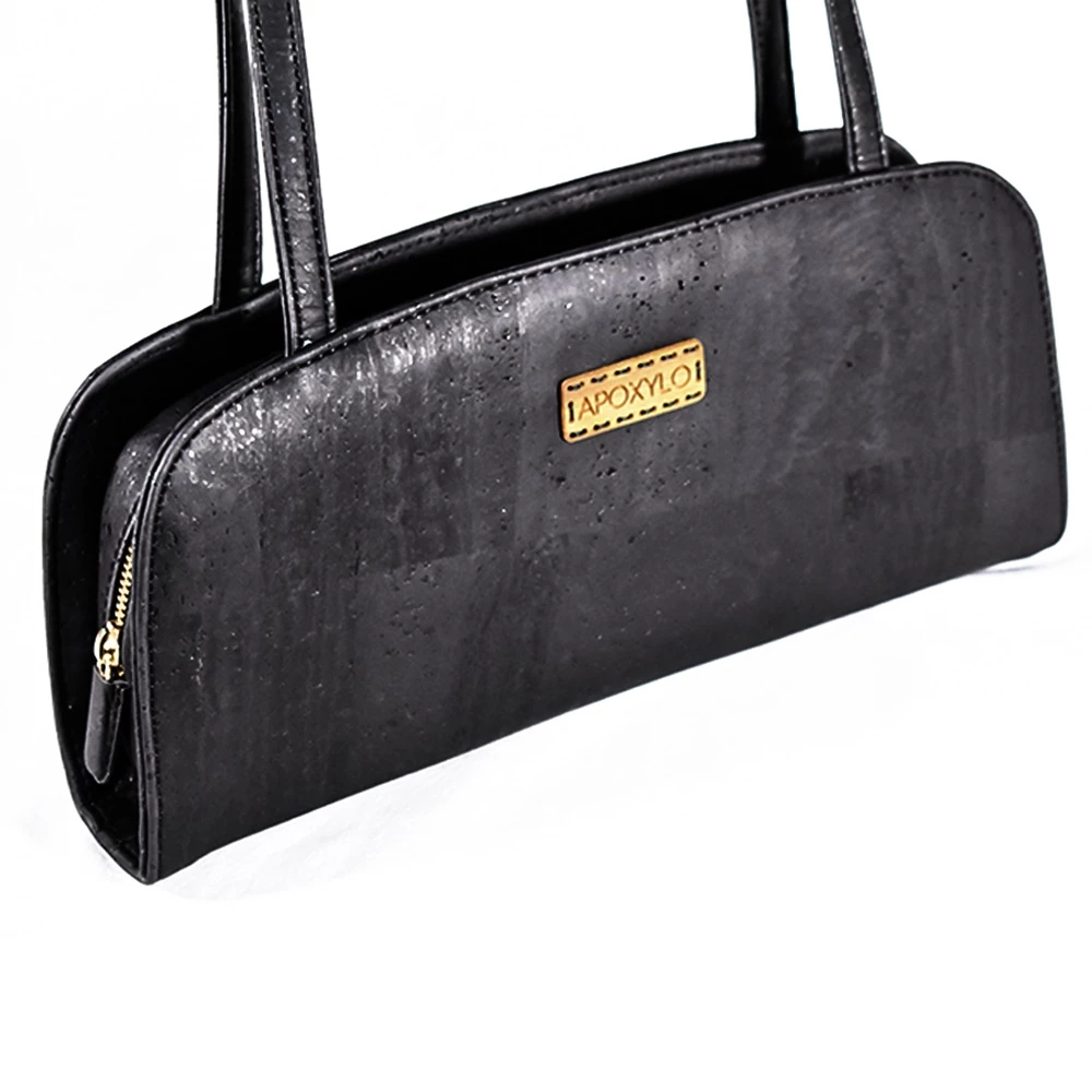 Γυναικεία τσάντα ώμου APOXYLO σε μαύρο χρώμα. Από φυσικό φελλό με χειροποίητο logo από φυσικό ξύλο ελιάς. Εσωτερική επένδυση με φυσικό βαμβακερό ύφασμα. Διαθέτει δύο μακριές χειρολαβές για τον ώμο και κλείνει με φερμουάρ. Συνοδεύεται από προστατευτική θήκη Apoxylo.