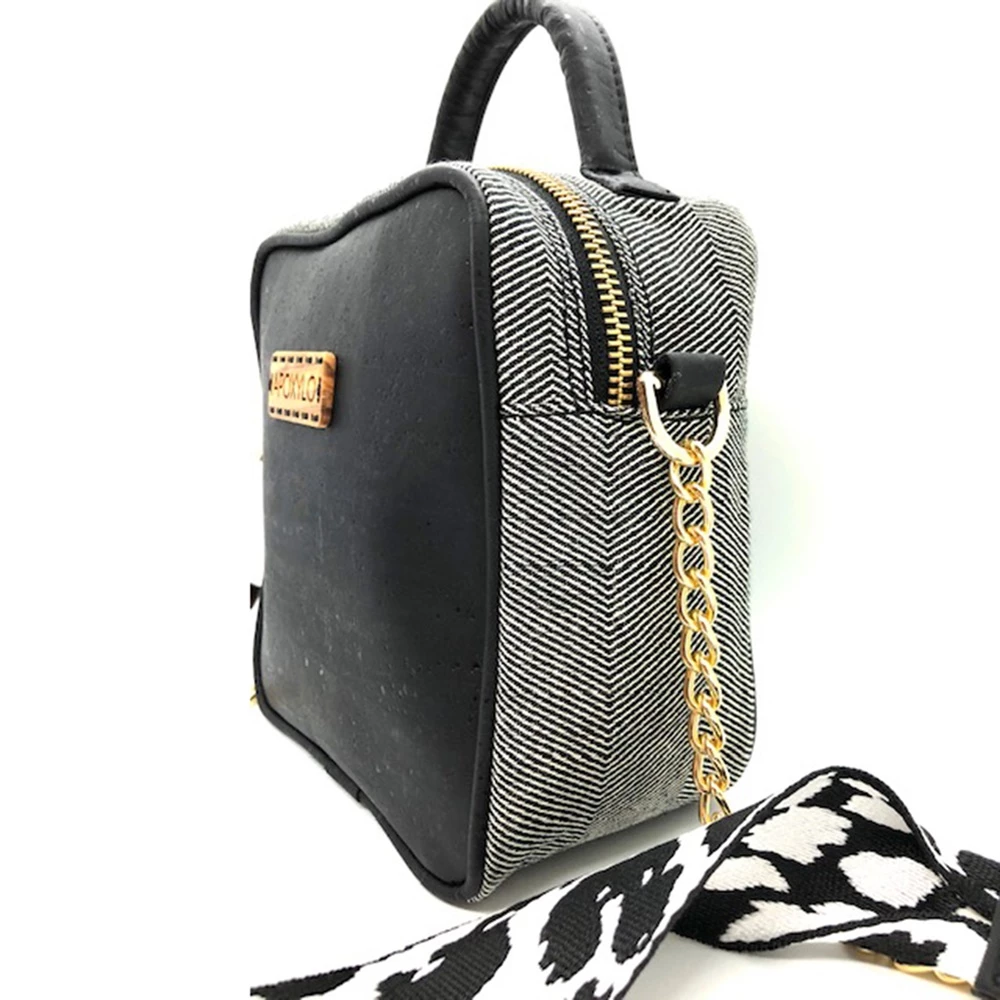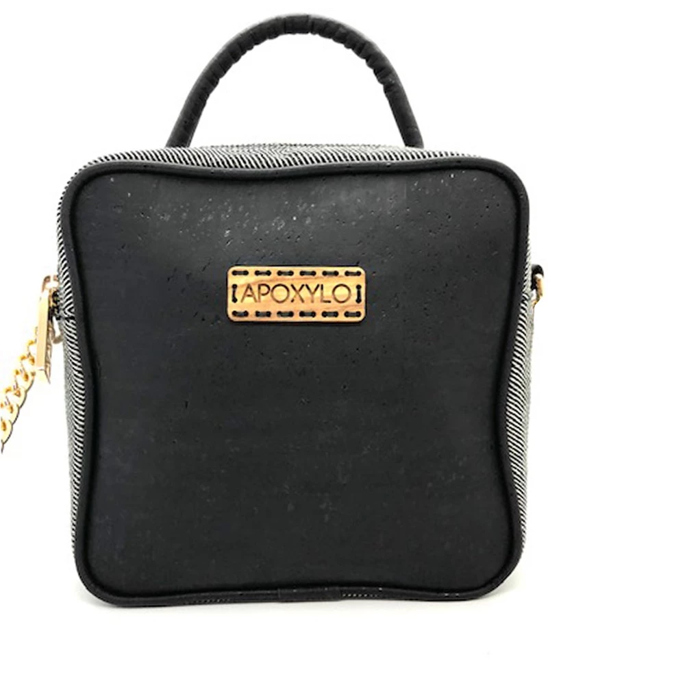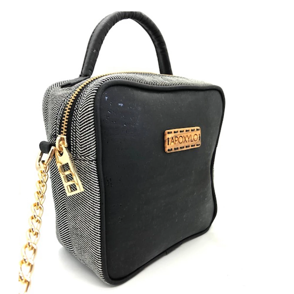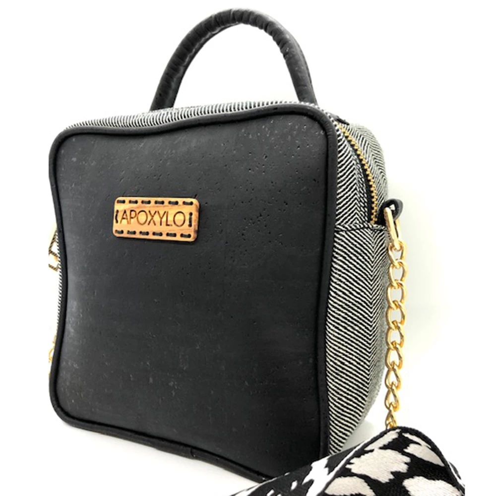 Γυναικεία τσάντα ώμου APOXYLO σε μαύρο και γκρι χρώμα με ριγέ μοτίβο. Κατασκευασμένη από φυσικό φελλό, με χειροποίητο logo από φυσικό ξύλο ελιάς. Εσωτερική επένδυση από φυσικό βαμβακερό ύφασμα. Επίχρυση αλυσίδα για τον ώμο. Κλείνει με φερμουάρ. Συνοδεύεται από προστατευτική θήκη Apoxylo.