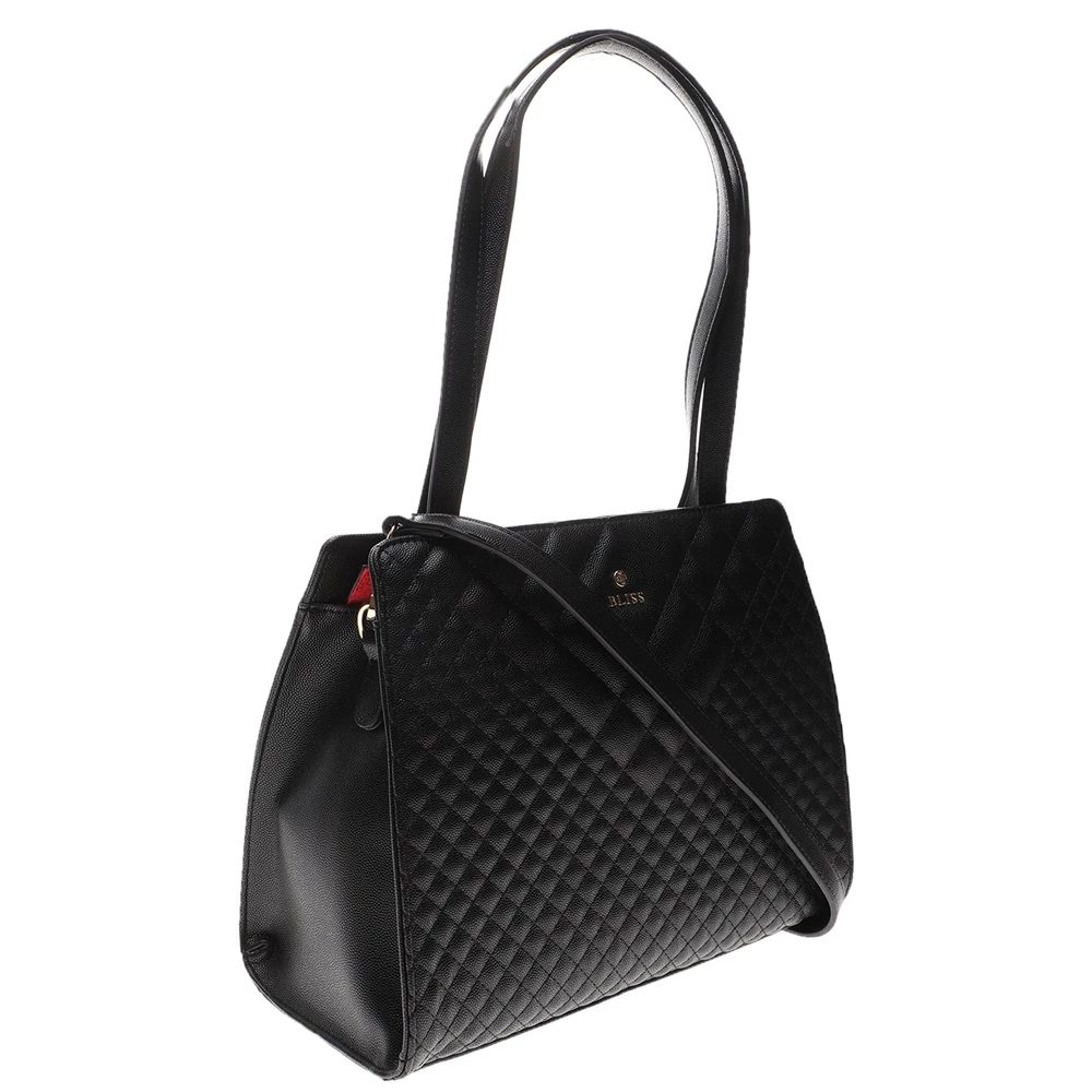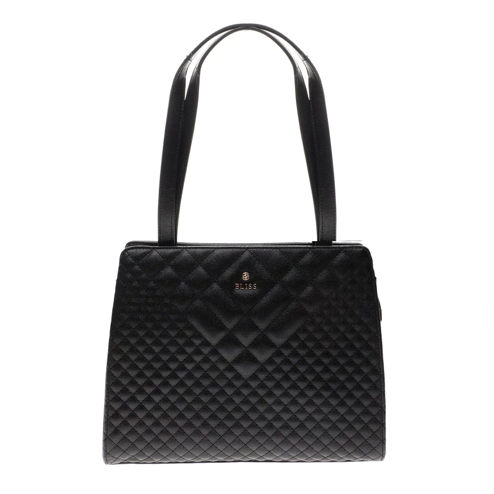 Γυναικεία τσάντα ώμου BLISS σε μαύρο χρώμα. Κατασκευασμένη από οικολογικό δέρμα με καπιτονέ μοτίβο και υφασμάτινη επένδυση. Διαθέτει δύο μακριές χειρολαβές για τον ώμο και αφαιρούμενο ιμάντα για να φοριέται και χιαστί. Μία εξωτερική τσέπη με φερμουάρ και μία εσωτερική. Κλείνει με φερμουάρ στο επάνω μέρος.