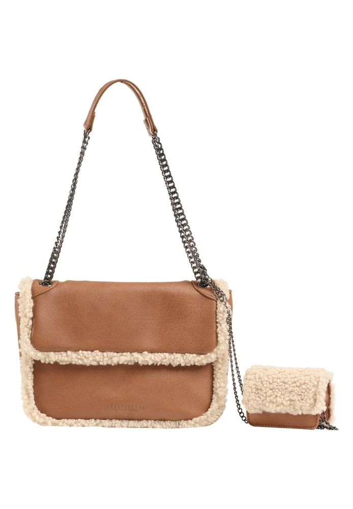 Γυναικεία τσάντα ώμου FUNKY BUDDHA σε καφέ απόχρωση. Από οικολογικό δέρμα, με συνθετική γούνα περιμετρικά. Διαθέτει μακριές χειρολαβές από μεταλλική αλυσίδα και αποσπώμενο πορτοφολάκι. Κλείνει με καπάκι και φερμουάρ στο επάνω μέρος.