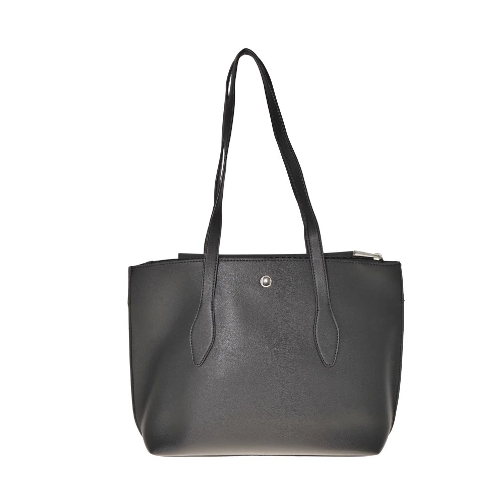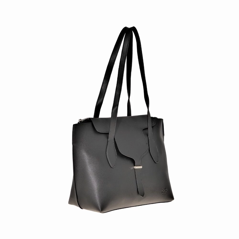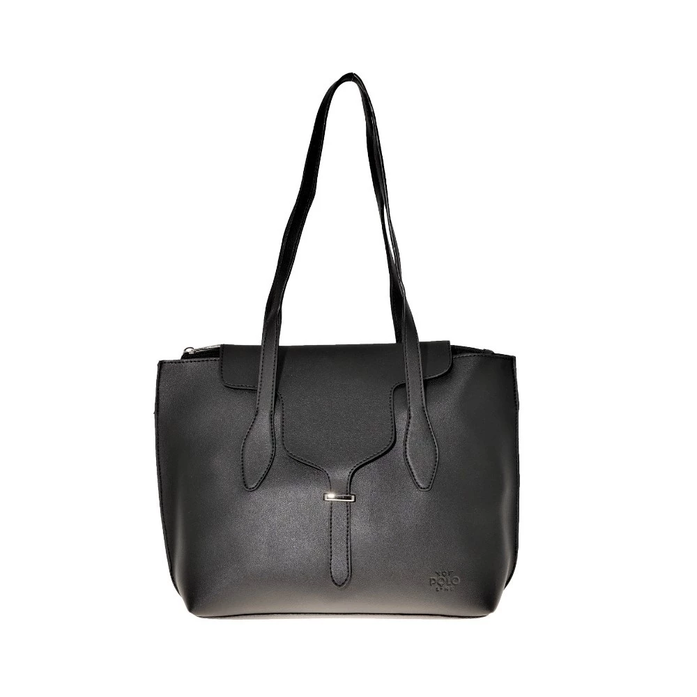 Γυναικεία τσάντα ώμου VQF POLO LINE σε μαύρο χρώμα. Από οικολογικά δέρμα, με δύο μακριές χειρολαβές στο επάνω μέρος. Δύο κυρίως τμήματα που κλείνουν με φερμουάρ. Ενα επιπλέον τμήμα που κλείνει με κουμπάκι.