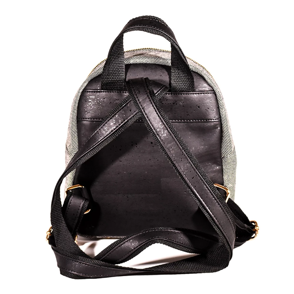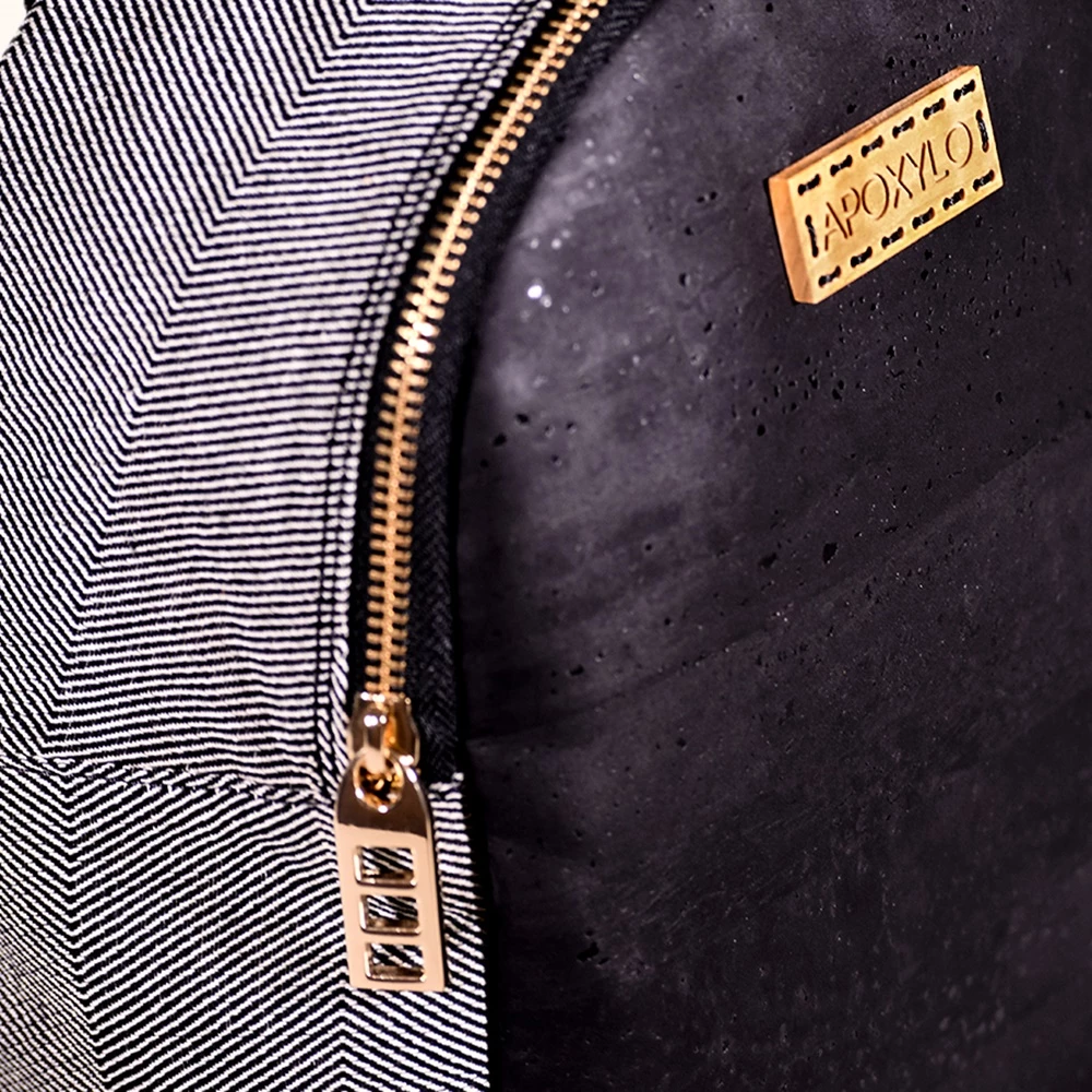 Γυναικεία τσάντα πλάτης APOXYLO σε μαύρη και γκρι απόχρωση με ριγέ μοτίβο. Κατασκευασμένη από φυσικό φελλό με χειροποίητο logo από φυσικό ξύλο ελιάς. Εσωτερική επένδυση με φυσικό βαμβακερό ύφασμα. Μία χειρολαβή στο επάνω μέρος και ρυθμιζόμενοι ιμάντες για την πλάτη. Κλείνει με φερμουάρ. Συνοδεύεται από προστατευτική θήκη Apoxylo.