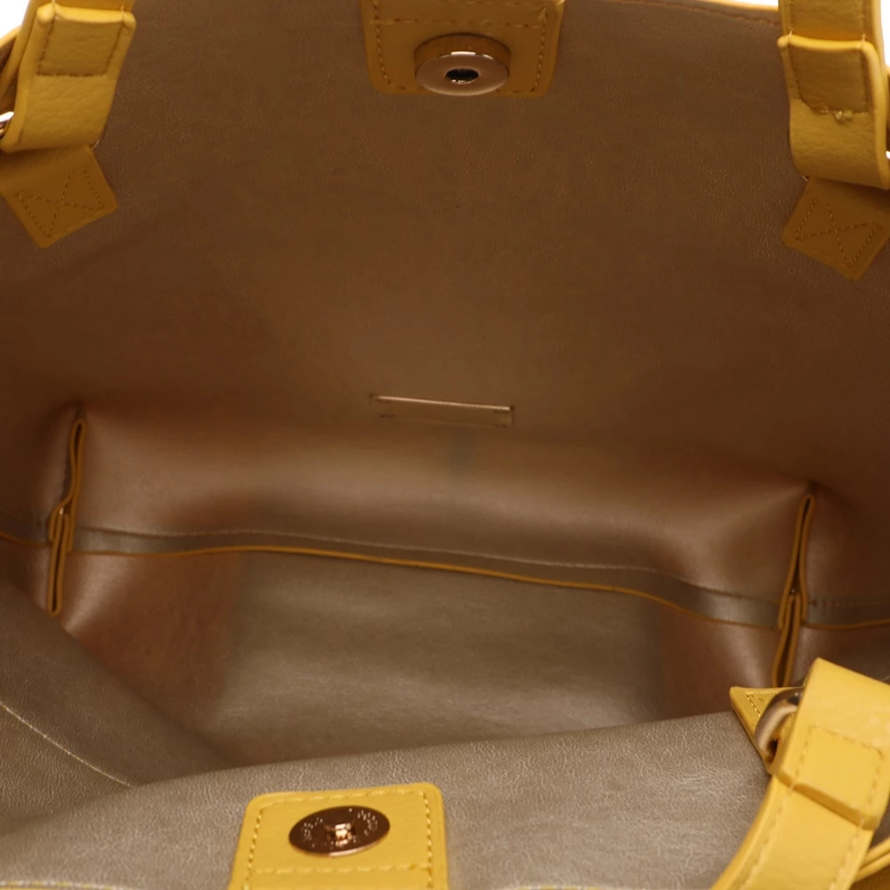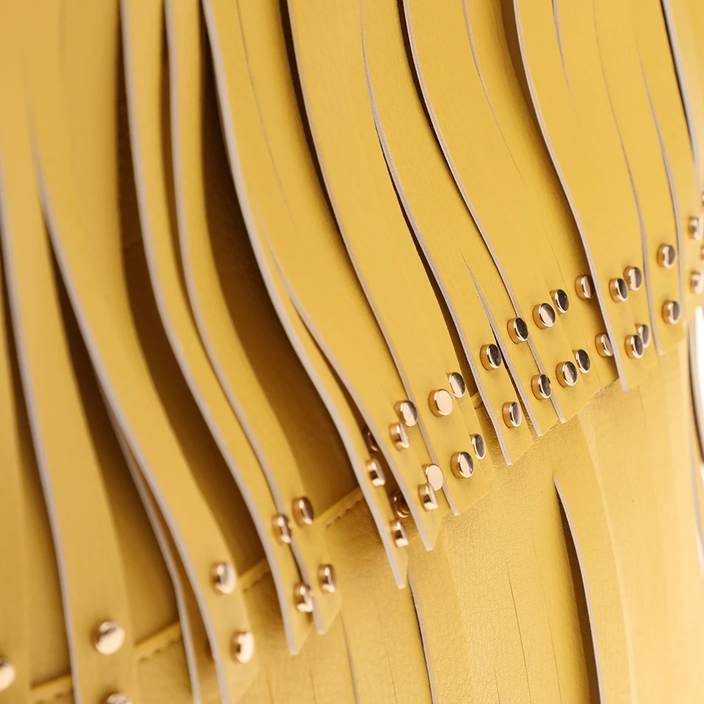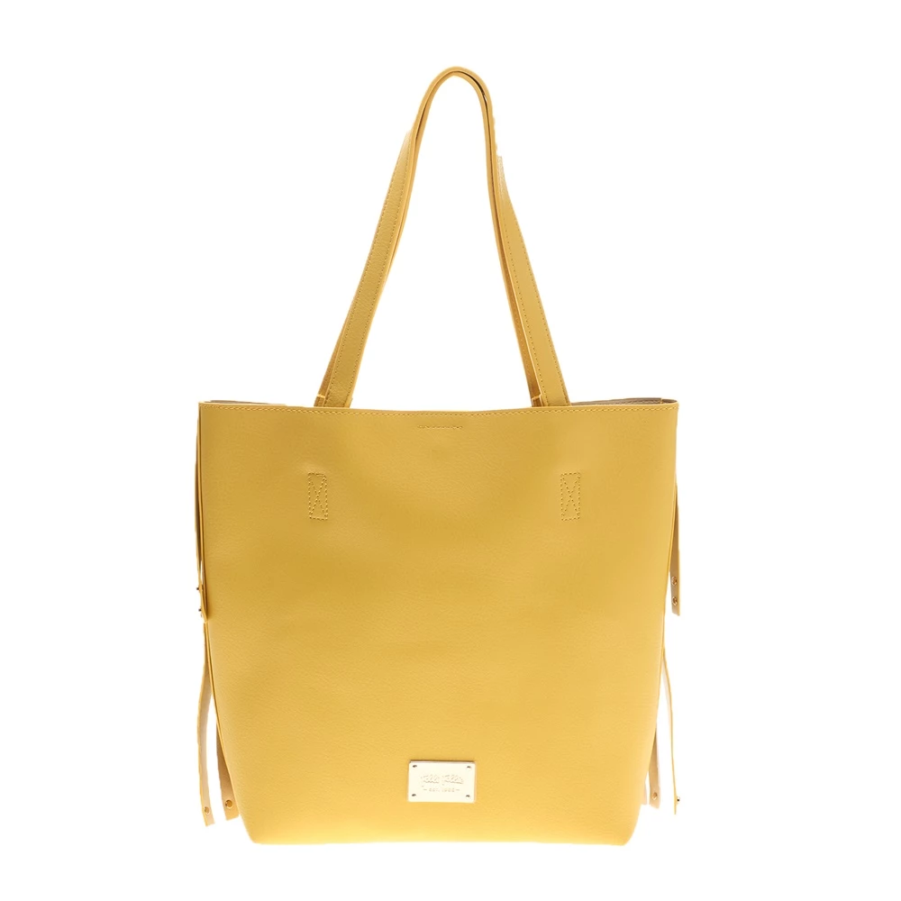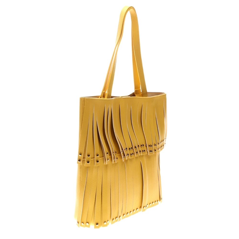 Γυναικεία τσάντα tote FOLLI FOLLIE από την συλλογή Fringe Dreams σε κίτρινη απόχρωση. Από συνθετικό δέρμα, με διακοσμητικά κρόσια και μεταλλικά τρουκς στη μία πλευρά. Μακριές χειρολαβές για τον ώμο και αποσπώμενο νεσεσέρ. Κλείνει με μαγνητικό κούμπωμα.