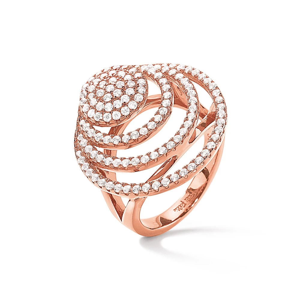 Γυναικείο δαχτυλίδι FOLLI FOLLIE CYCLOS από ροζ χρυσό επιμεταλλωμένο ασήμι 925°. Μοτίφ με τρία περιγράμματα από κύκλους διακοσμημένους με πέτρες ζιργκόν. Ένα εντυπωσιακό και κομψό κόσμημα που θα δώσει διακριτική λάμψη σε κάθε σας σύνολο.