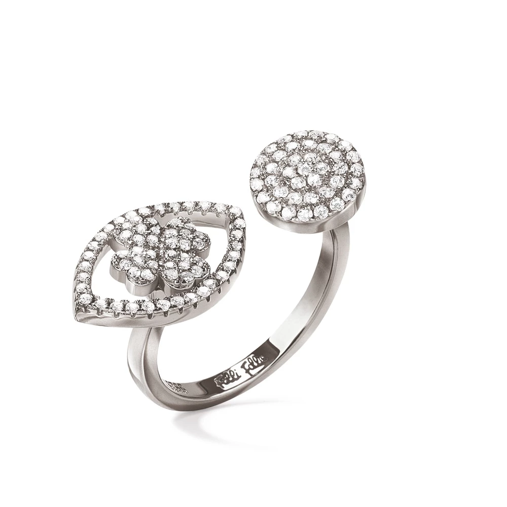 Γυναικείο δαχτυλίδι FOLLI FOLLIE HEART4HEART MATI από ασήμι 925°. Δύο μοτίφ, ένα στρογγυλό και ένα με τις χαρακτηριστικές τέσσερεις καρδιές μέσα σε περίγραμμα μάτι, διακοσμημένα με πέτρες ζιργκόν. Ένα εντυπωσιακό και κομψό κόσμημα που θα δώσει λάμψη σε κάθε σας σύνολο.