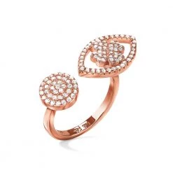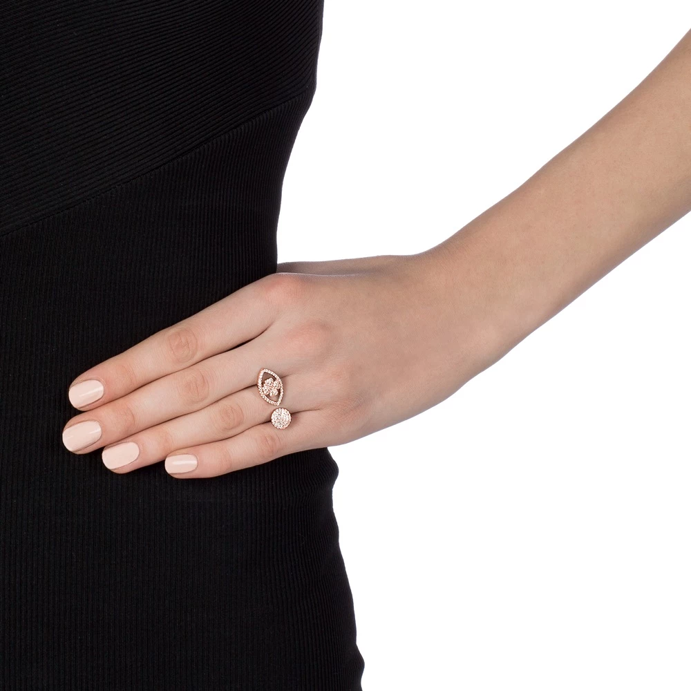 Γυναικείο δαχτυλίδι FOLLI FOLLIE HEART4HEART MATI από επιμεταλλωμένο ροζ χρυσό ασήμι 925°. Δύο μοτίφ, ένα στρογγυλό και ένα με τις χαρακτηριστικές τέσσερεις καρδιές μέσα σε περίγραμμα μάτι, διακοσμημένα με πέτρες ζιργκόν. Ένα εντυπωσιακό και κομψό κόσμημα που θα δώσει λάμψη σε κάθε σας σύνολο.