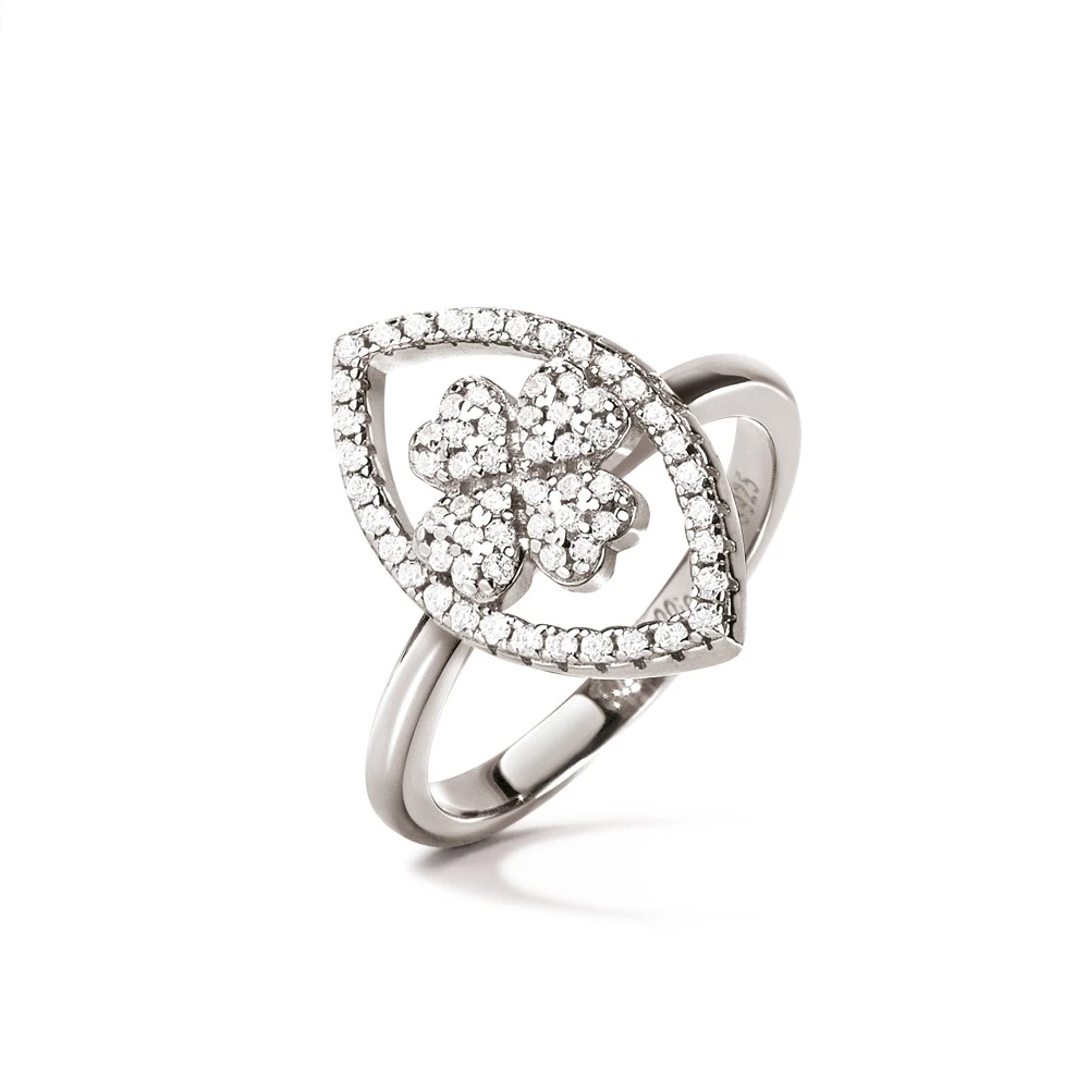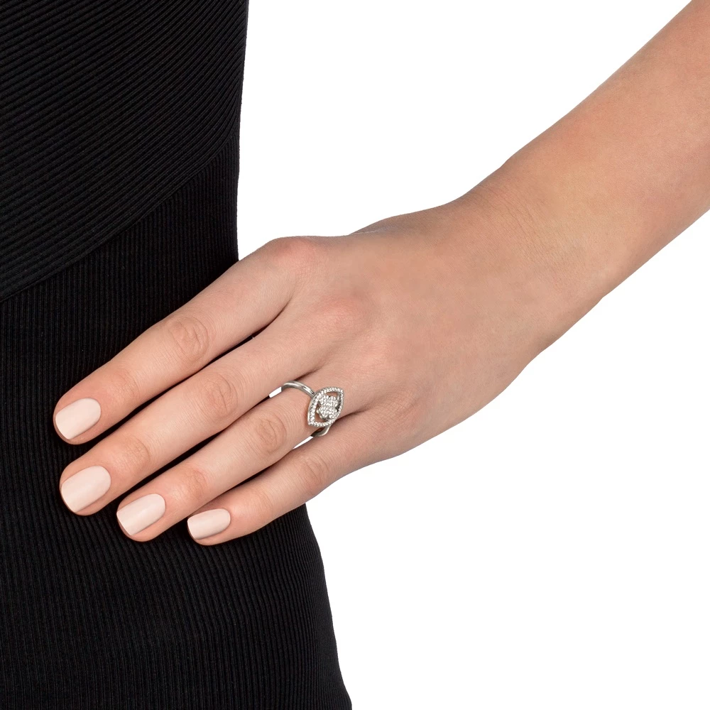Γυναικείο δαχτυλίδι FOLLI FOLLIE HEART4HEART MATI από ασήμι 925°. Λεπτή βέρα με μοτίφ τις χαρακτηριστικές τέσσερεις καρδιές και περίγραμμα μάτι, διακοσμημένα με πέτρες ζιργκόν. Ένα κομψό κόσμημα που θα δώσει διακριτική λάμψη σε κάθε σας σύνολο.