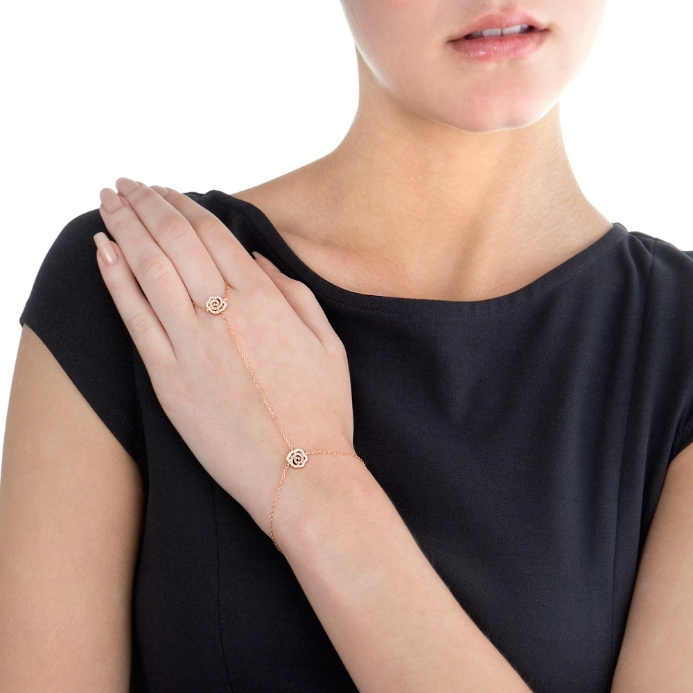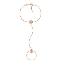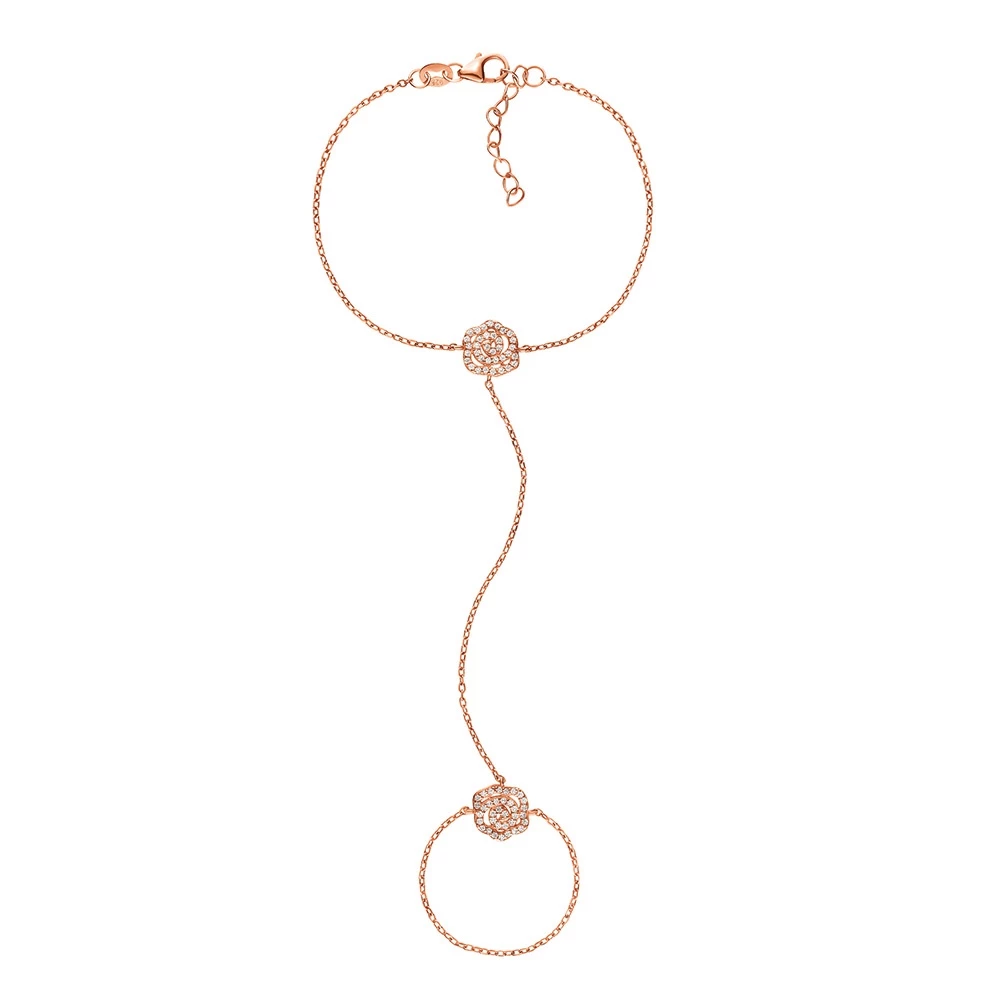 Γυναικείο διπλό βραχιόλι με δαχτυλίδι από τη συλλογή FASHIONABLY SILVER STORIES, σε ροζ-χρυσή απόχρωση. Κομψό, με μοτίφ λουλούδι διακοσμημένα από αστραφτερές πέτρες και εντυπωσιακό σχέδιο που είναι σίγουρο ότι θα χαρίσει λάμψη σε κάθε σας look!