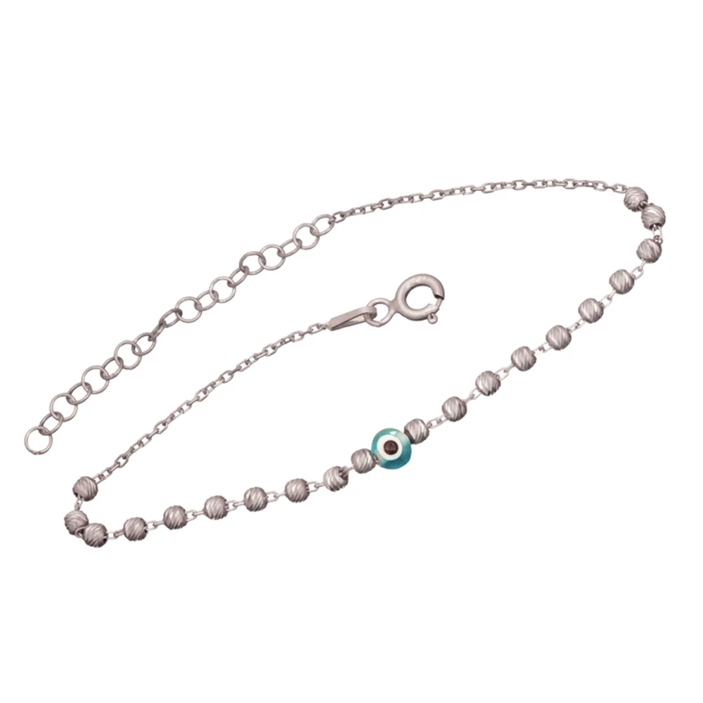 Γυναικείο ασημένιο 925 επιπλατινωμένο βραχιόλι JEWELTUDE Αλυσίδα Μπίλιες με mini χάντρα Μάτι. Ενα κλασσικό κόσμημα που συνδυάζει κομψότητα και διαχρονικότητα. Σίγουρα θα χαρίσει μια λαμπερή χαρούμενη νότα στις καθημερινές σας εμφανίσες. Το καλότυχο φυλαχτό Προστασίας που αξίζει μια θέση στην συλλογή σας και θα φορέσετε διαχρονικά. Προτείνουμε να το χαρίσετε και ως ενα προσωπικό δώρο με προσιτή τιμή και ευοίωνο συμβολισμό. Η αλυσίδα χεριού διαθέτει προέκταση κρίκους για να το προσαρμόσετε στον καρπό σας.