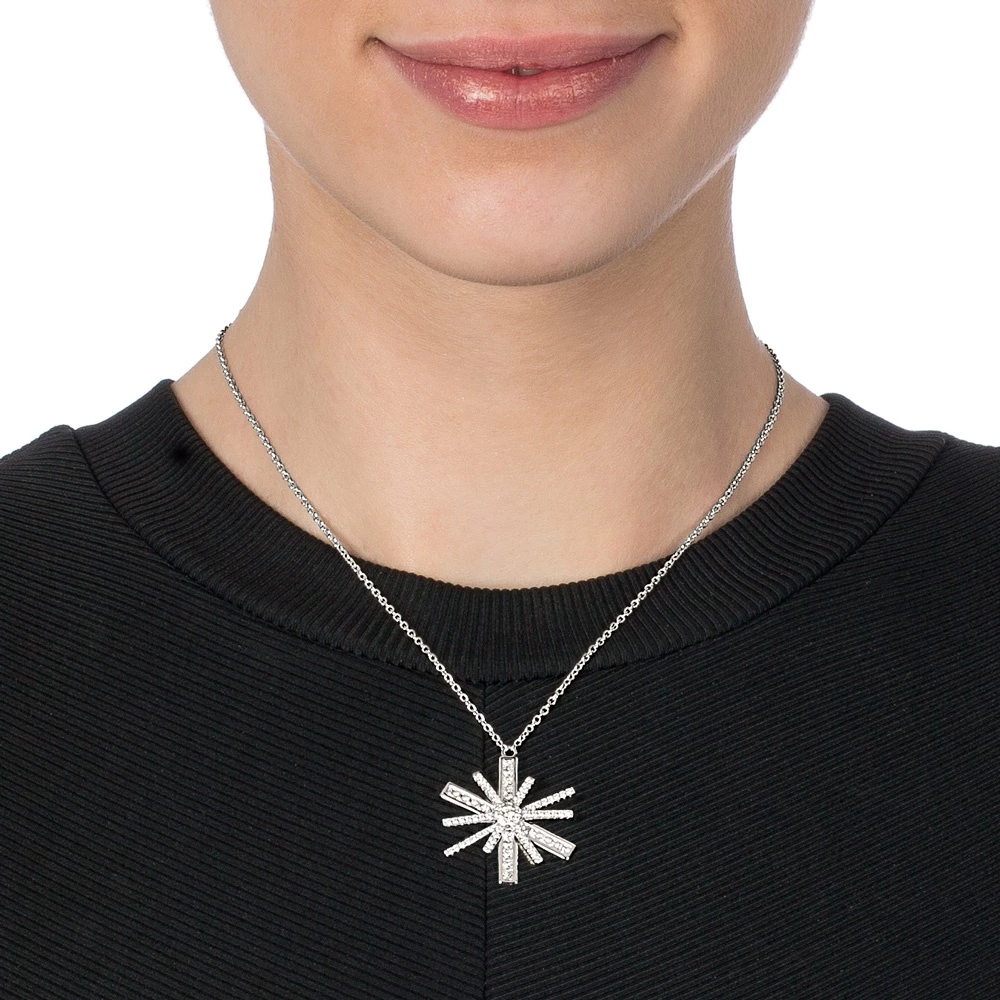 Γυναικείο κολιέ FOLLI FOLLIE STAR FLOWER από ασήμι 925°. Μεγάλο παντατίφ σε σχήμα αστεροειδούς λουλουδιού διακοσμημένο με πέτρες ζιργκόν. Διαθέτει λεπτή αλυσίδα με προέκταση, για να ρυθμίζετε το μήκος του. Ένα κομψό κόσμημα με ρομαντική αισθητική, που μπορείτε να φορέσετε από το πρωί μέχρι το βράδυ
