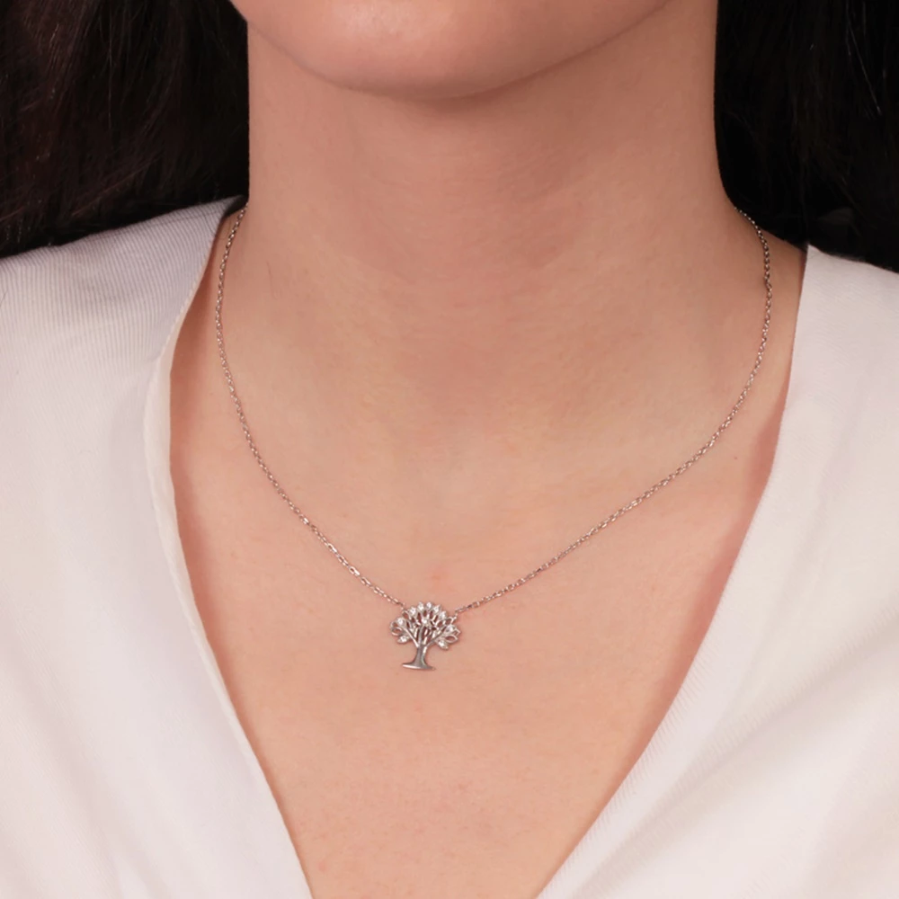 Γυναικείο κοντό κολιέ JEWELTUDE από ασήμι 925. Λεπτή αλυσίδα με προέκταση, και pantatif το Δέντρο της Ζωής, διακοσμημένο με λευκά ζιργκόν που χαρίζουν λάμψη.