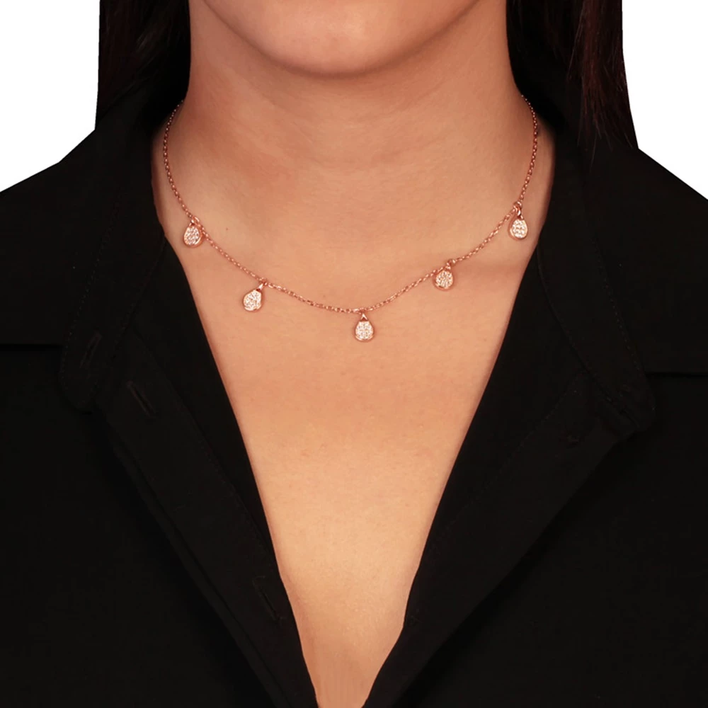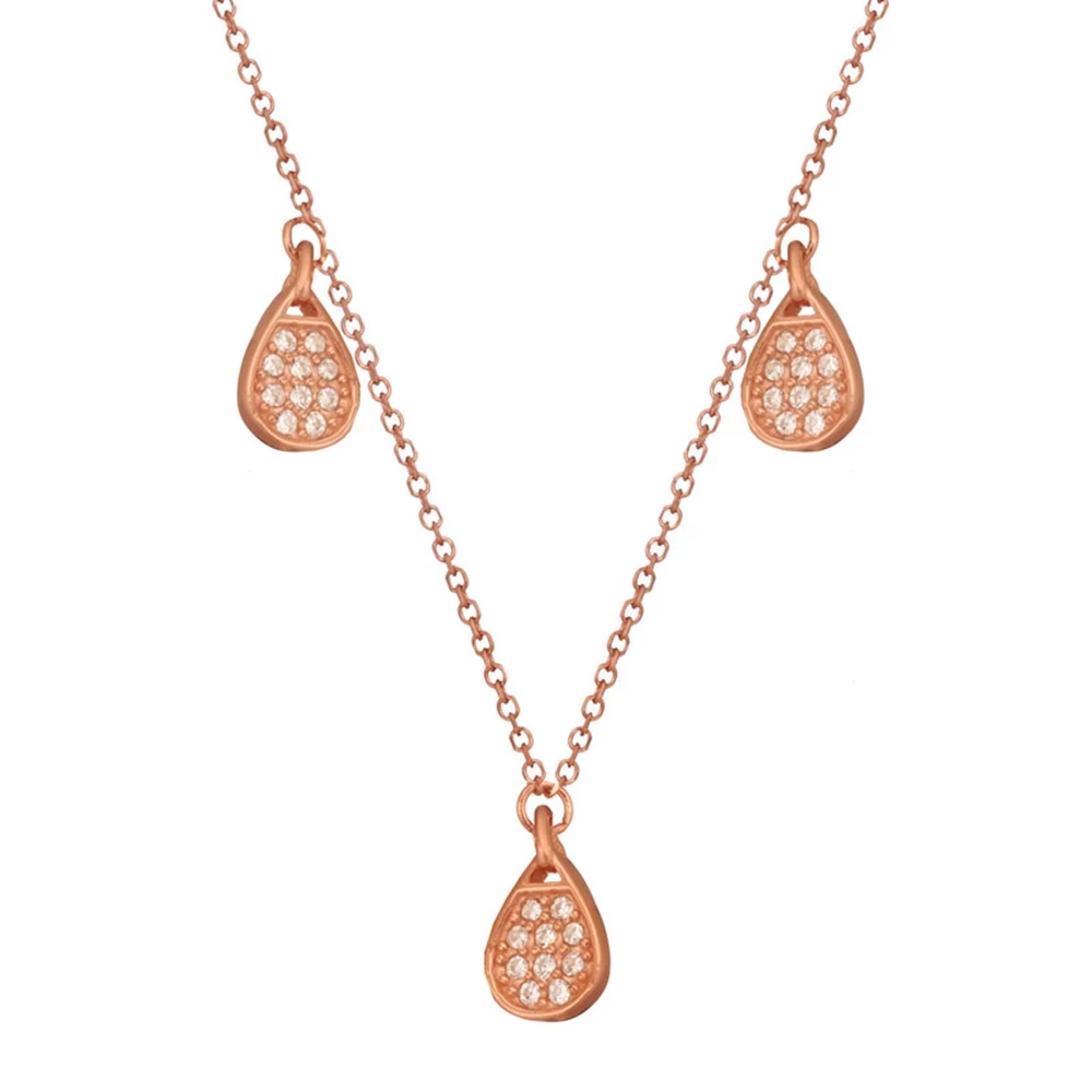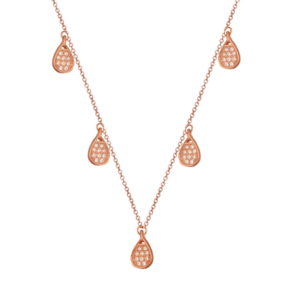 Γυναικείο ασημένιο 925 επιχρυσωμένο σε 18k ροζ χρυσό κολιέ JEWELTUDE. Σταγόνες, με pave καρφωμένα λευκά ζιργκόν. Τα πέντε σειρέ κρεμαστά θα στολίσουν το ντεκολτέ σας μαγνητίζοντας όλα τα βλέμματα θαυμασμού. Ενα και ξεχωριστό που θα πρωταγωνιστήσει σε κάθε chic εμφάνιση. Το υπέροχο κόσμημα με στυλιστική και διαχρονική αξία, που πρέπει να έχει μια θέση στην κοσμηματοθήκη σας. Μια εξαιρετική επιλογή και για ενα πολυτελής δώρο που θα δημιουργήσει αγαπημένες αναμνήσεις.