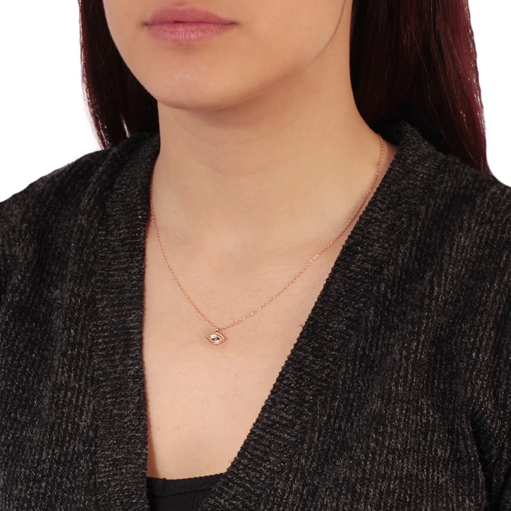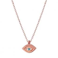 Γυναικείο κοντό κολιέ JEWELTUDE από ασήμι 925 με ρόζ επιχρύσωση. Λεπτή αλυσίδα με κρεμαστό pantatif μάτι διακοσμημένο με τιρκουάζ πέτρα. Ένα διακριτικό κόσμημα, που θα αγαπήσετε με την