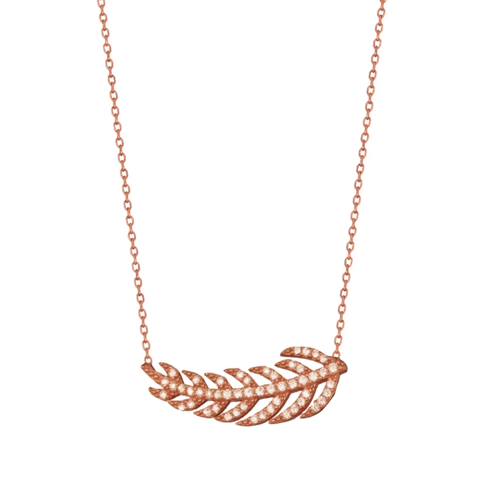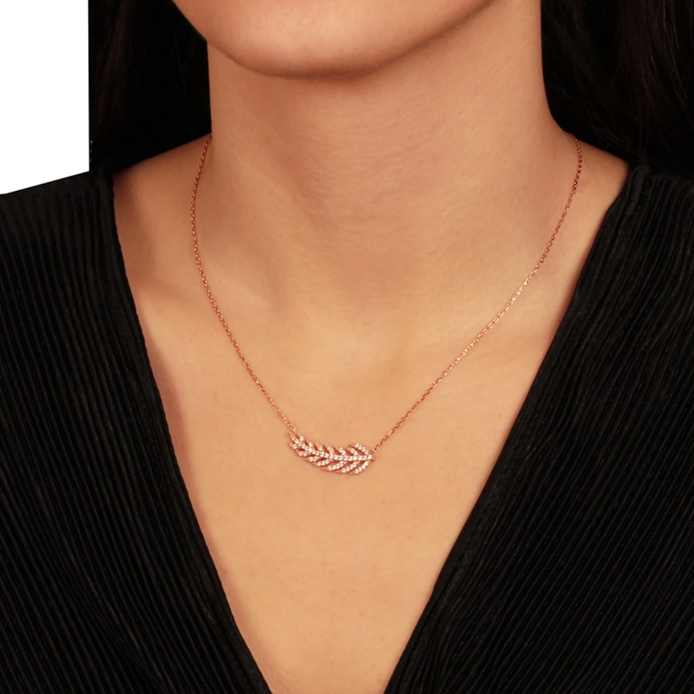 Γυναικείο κοντό κολιέ JEWELTUDE από ασήμι 925 με ροζ χρυσή επιχρύσωση σε 14k. Λεπτή αλυσίδα με motif ένα πλάγιο Φτερό, διακοσμημένο με λευκά ζιργκόν που τονίζουν το