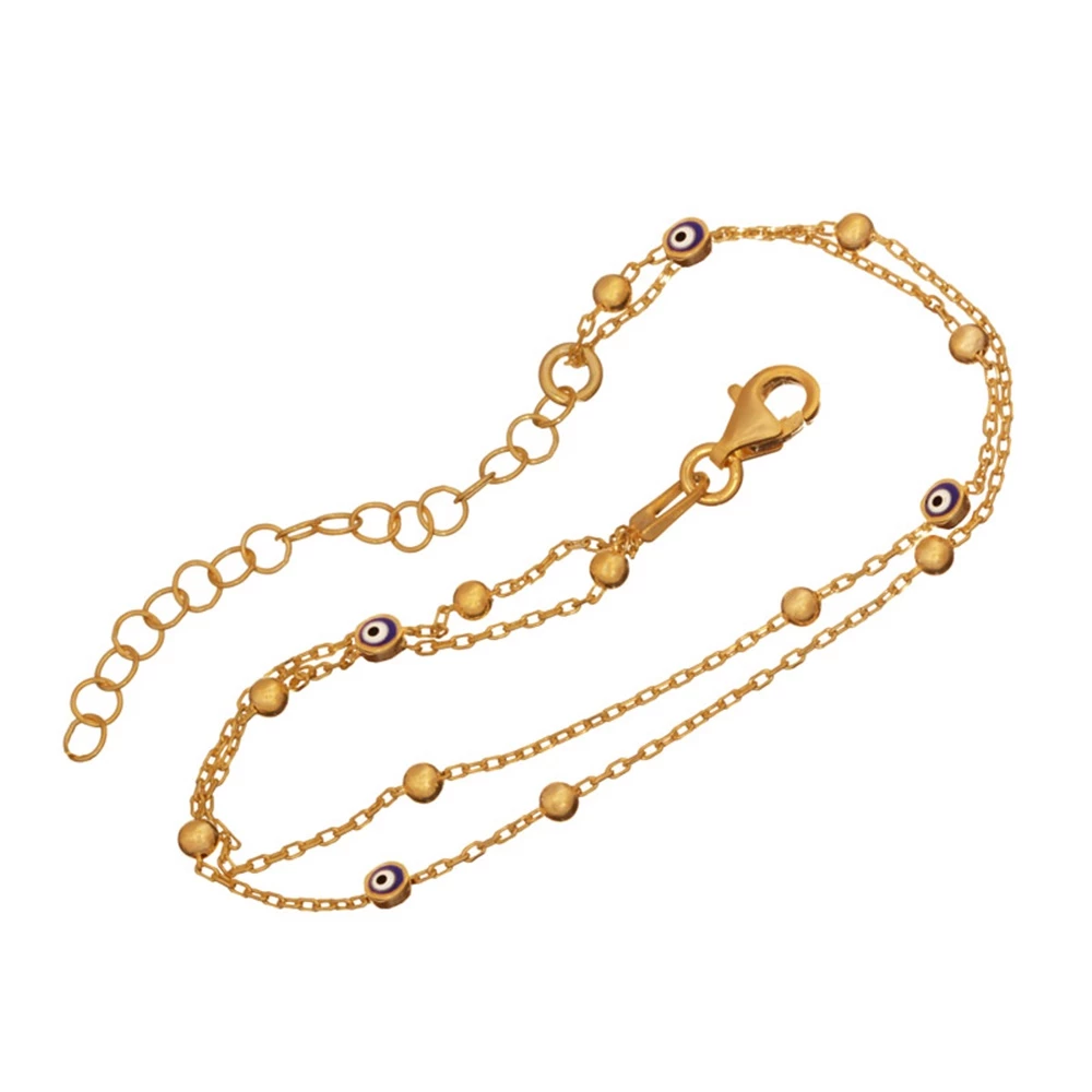 Γυναικείο βραχιόλι JEWELTUDE από ασήμι 925 με κίτρινη επιχρύσωση 18k. Διπλή λεπτή με motif μικρές μπίλιες και ματάκια φιλοτεχνημένα από σμάλτο. Διαθέτει προέκταση κρίκους για να το προσαρμόσετε στον καρπό σας.