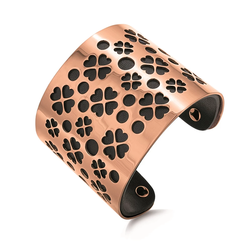Γυναικείο φαρδύ βραχιόλι FOLLI FOLLIE από την συλλογή HEART 4 HEART σε ροζ χρυσή απόχρωση. Από συνθετικό δέρμα στην εσωτερική πλευρά και σταθερό μπρασελέ από επιμεταλλωμένο ατσάλι εξωτερικά. Διάτρητο μοτίβο με το χαρακτηριστικό τετράφυλλο από καρδιές σε όλη την επιφάνεια. Μία rock πινελιά στις καθημερινές σας εμφανίσεις!