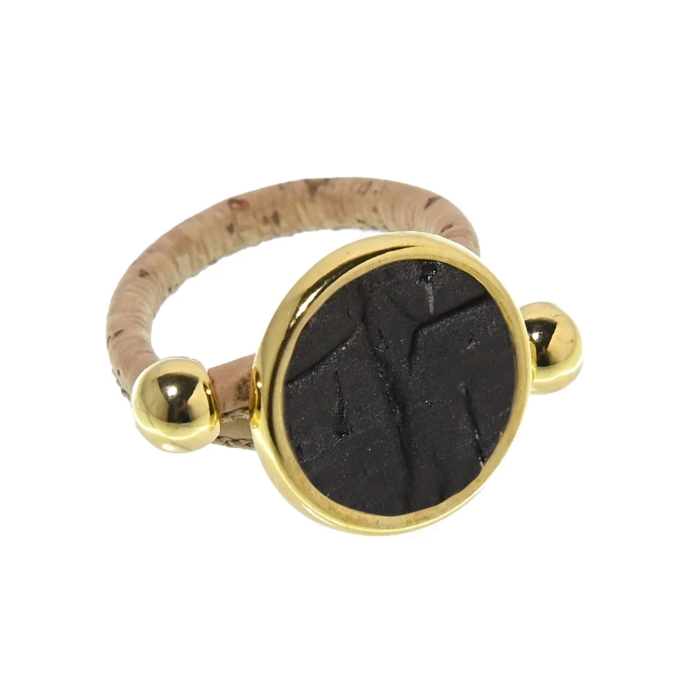 Γυναικείο δαχτυλίδι APOXYLO από κορδόνι φυσικού φελλού, με διακοσμητική μαύρη ακρυλική πέτρα σε επιχρυσωμένη μεταλλική βάση. Αυξομειούμενο μέγεθος για να προσαρμόζεται σε όλα τα δάχτυλα.