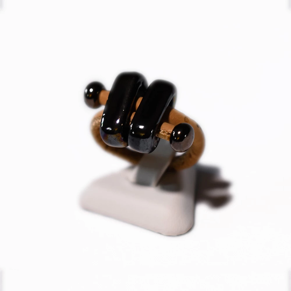Γυναικείο δαχτυλίδι APOXYLO DOUBLE BLACK. Από κορδόνι φυσικού φελλού σε καφέ χρώμα και μαύρες κεραμικές πέτρες. Αυξομειούμενο μέγεθος για να προσαρμόζεται σε όλα τα δάχτυλα. Συνοδεύεται από χειροποίητο κουτί Apoxylo.
