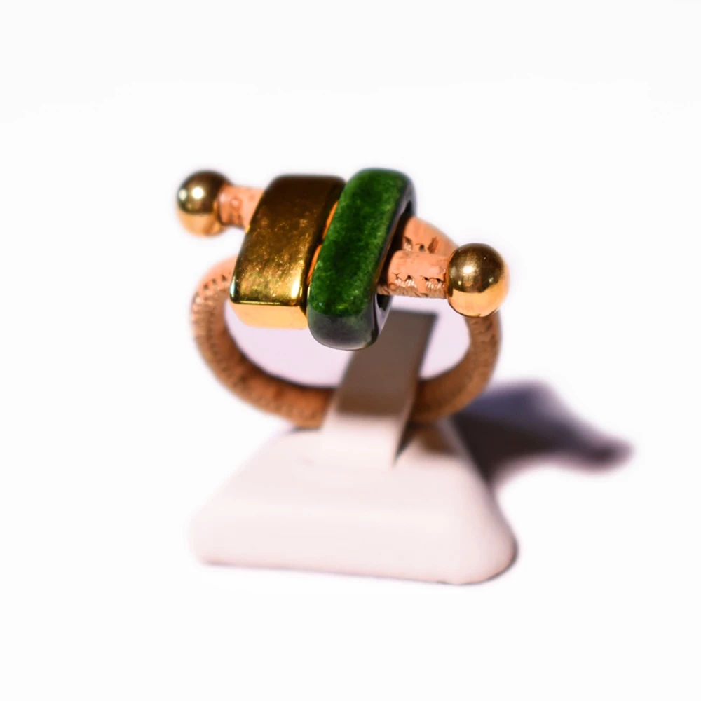 Γυναικείο δαχτυλίδι APOXYLO GIGI. Από κορδόνι φυσικού φελλού σε εκρού απόχρωση. Διακοσμείται με μία επιχρυσωμένη μεταλλική πέτρα και μία κεραμική σε πράσινη απόχρωση. Αυξομειούμενο μέγεθος για να προσαρμόζεται σε όλα τα δάχτυλα. Συνοδεύεται από χειροποίητο κουτί Apoxylo.