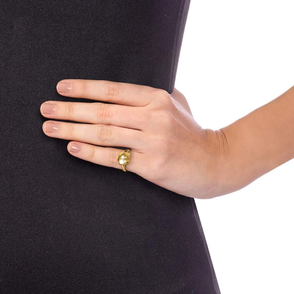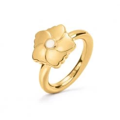 Γυναικείο δαχτυλίδι chevalier FOLLI FOLLIE της συλλογής Bloom Bliss από ατσάλι με κίτρινη χρυσή επιμετάλλωση. Βέρα με motif mini λουλούδι διακοσμημένο με λευκό φίλντισι.