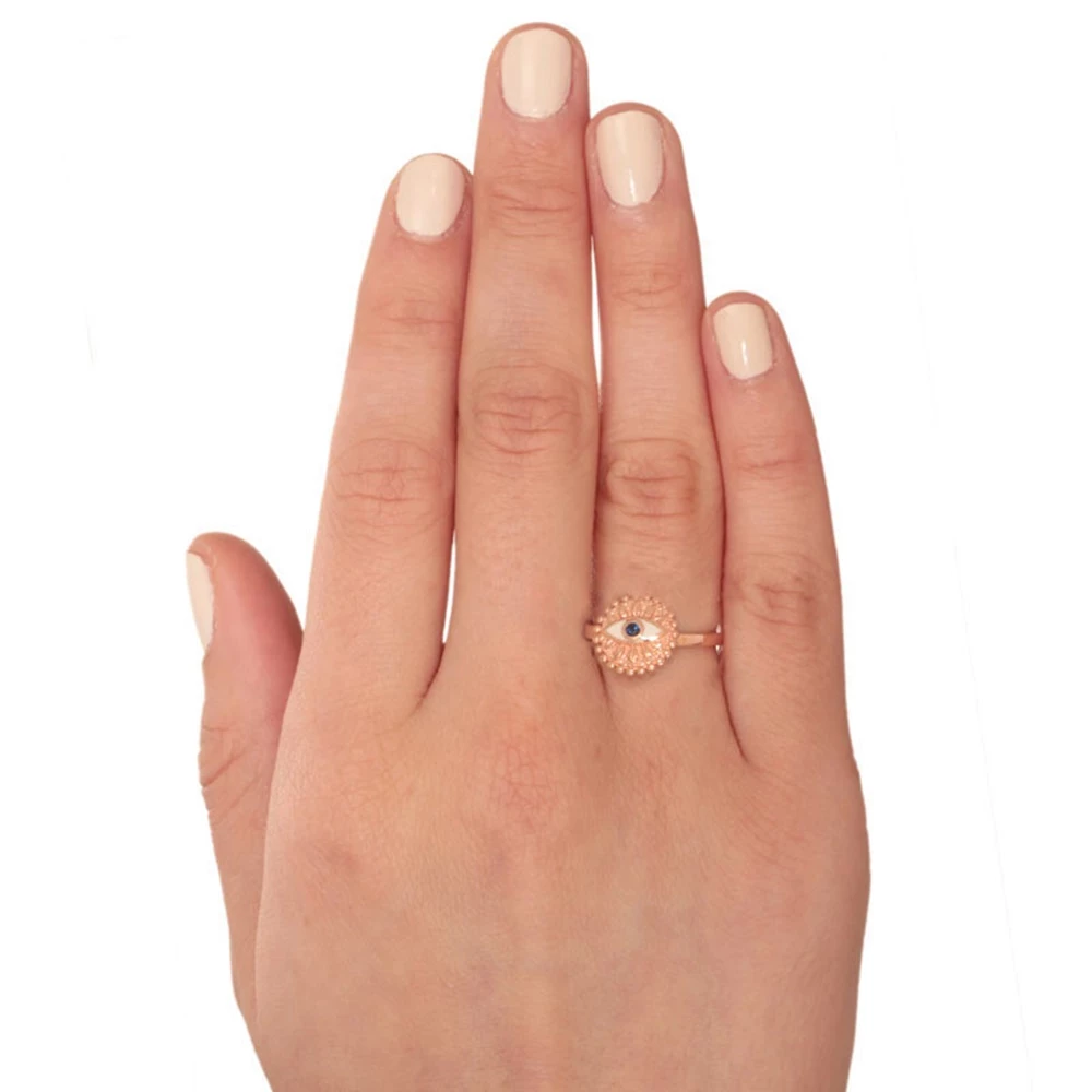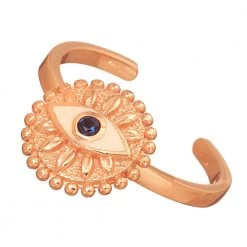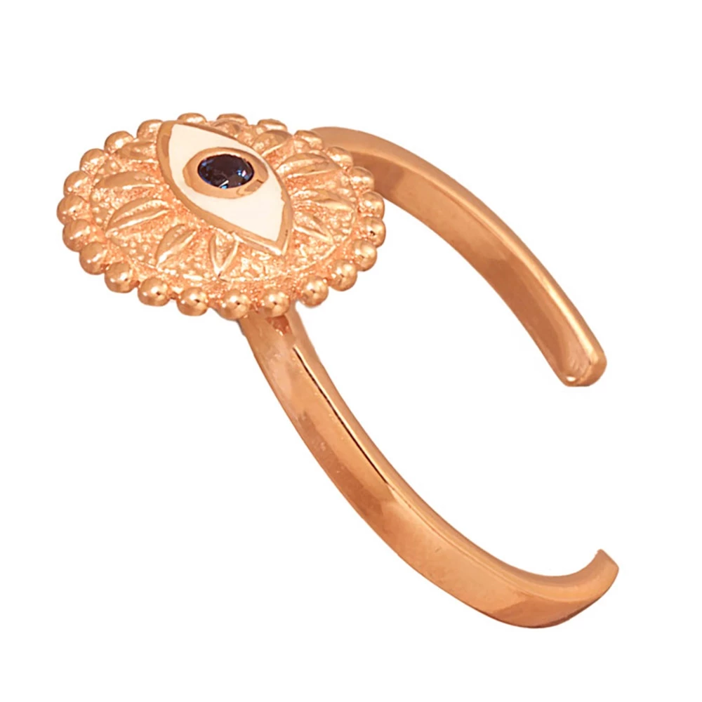 Γυναικείο δαχτυλίδι JEWELTUDE από ροζ επιχρυσωμένο ασήμι 925°. Λεπτή βέρα με motif ματάκι στο κέντρο και με άνοιγμα για να προσαρμόζεται άψογα σε όλα τα δάχτυλα.