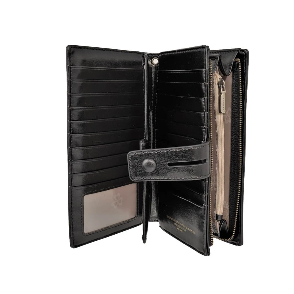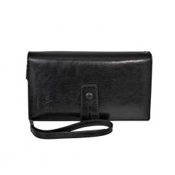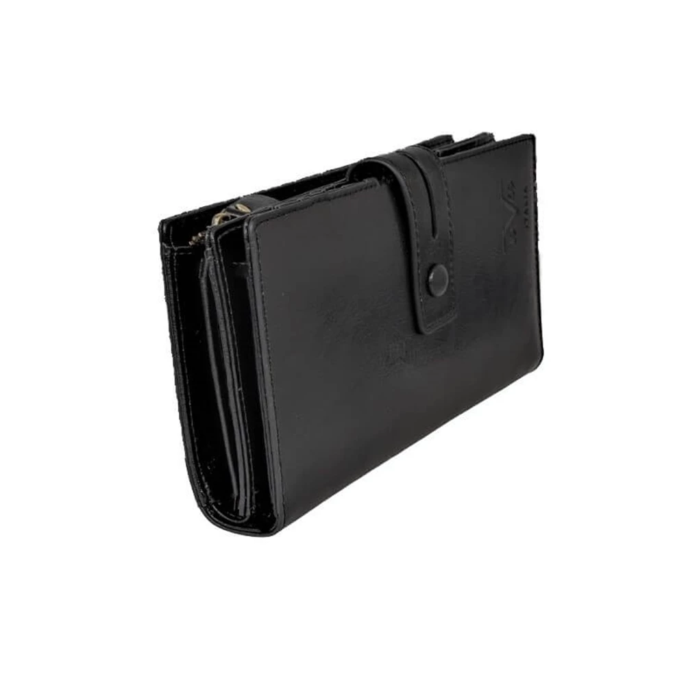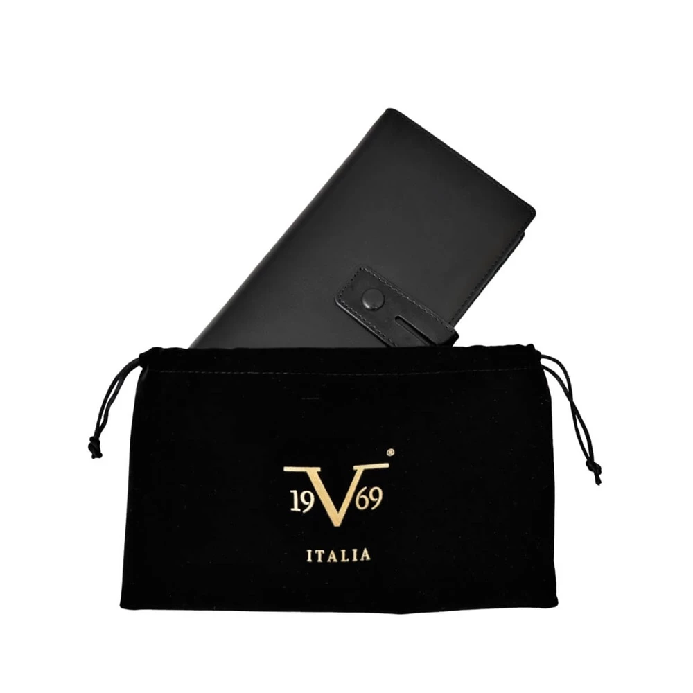 Γυναικείο δερμάτινο πορτοφόλι της εταιρίας 19V69 ITALIA σε μαύρο χρώμα. Κατασκευασμένο από δέρμα μεγάλης αντοχής για καθημερινή χρήση. Διαθέτει δύο ξεχωριστούς χώρους με πολλαπλές θήκες για κάρτες, έγγραφα και στιλό, μία τσέπη με φερμουάρ για τα κέρματα και θήκες για χαρτονομίσματα και ταυτότητα. Αποσπώμενη χειρολαβή. Κλείνει με φερμουάρ και κουμπάκι. Παραδίδεται σε πολυτελή βελούδινη μαύρη θήκη 19V69 ITALIA.