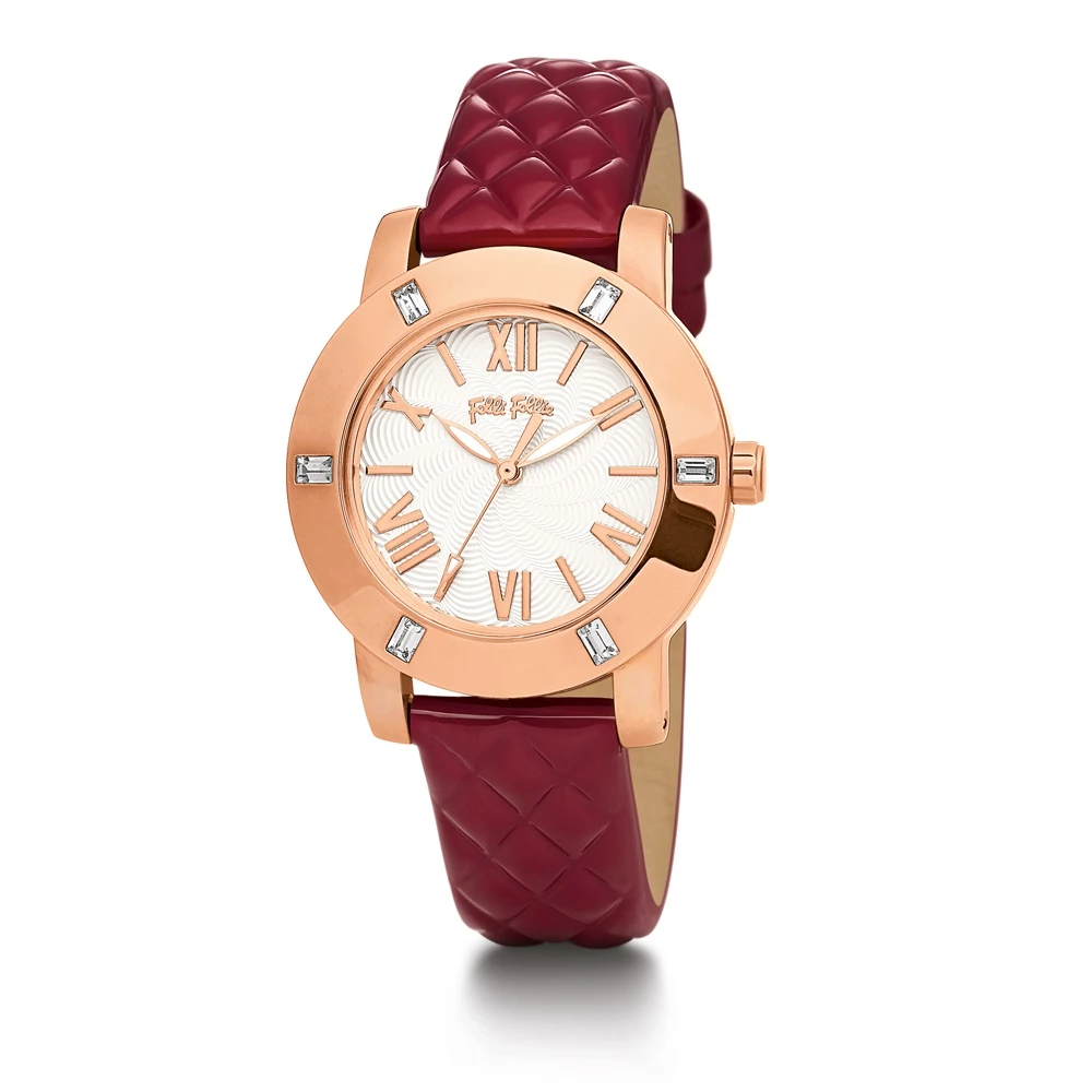 Γυναικείο ρολόι από τη συλλογή DONATELLA της Folli Follie. Διαθέτει δερμάτινο κόκκινο λουράκι με καπιτονέ σχέδιο, στρογγυλή κάσα σε ροζ-χρυσή απόχρωση, διακοσμημένη από αστραφτερές πέτρες. Θα χαρίσει τη ποαλυτέλεια και τη λάμψη που επιθυμείτε στις καθημερινές σας εμφανίσεις.