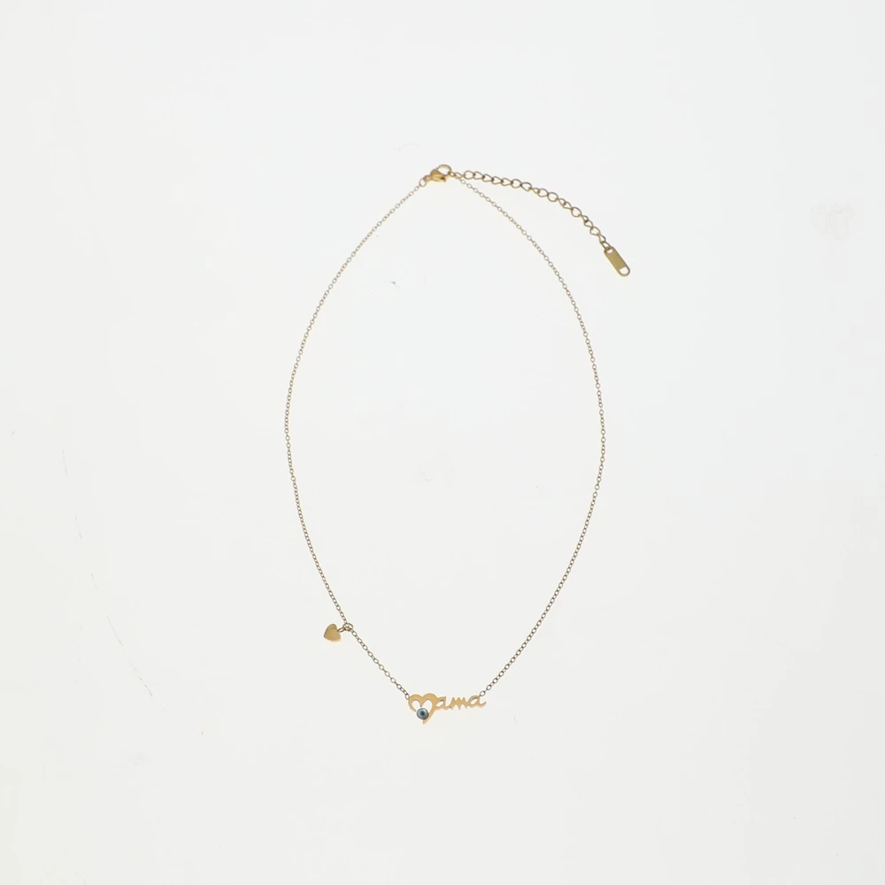 Γυναικείο κολιέ ERMINA KASS MAMA HEART χρυσό. Από ατσάλι, με επιχρύσωση. Λεπτή αλυσίδα, με μενταγιόν “mama” και ματάκι και επίχρυση καρδιά.