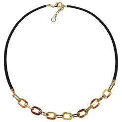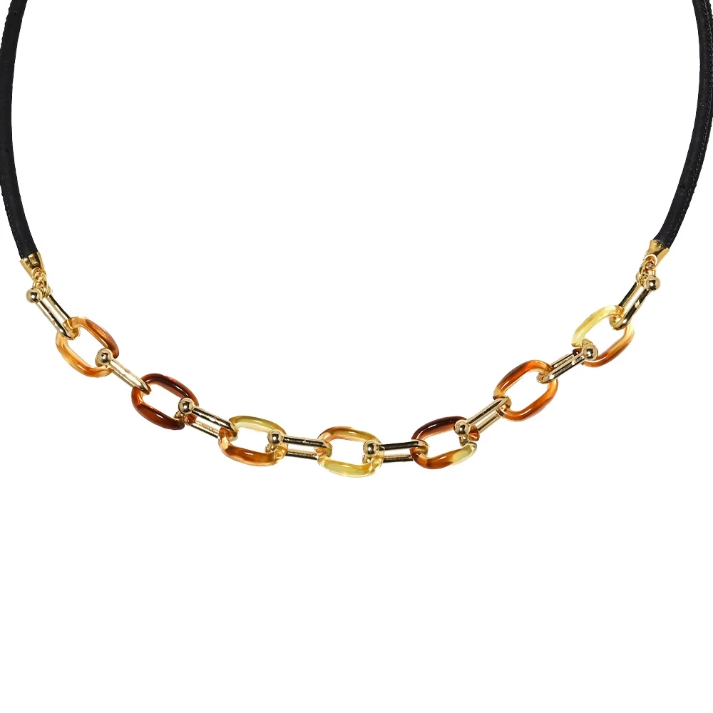 Γυναικείο κολιέ APOXYLO σε μαύρο χρώμα. Κατασκευασμένο από φυσικό φελλό με επίχρυσες μεταλλικές λεπτομέρειες και αλυσίδα με τετραγωνισμένους κρίκους από ακρυλικό. Συνοδεύεται από χειροποίητο κουτί Apoxylo.