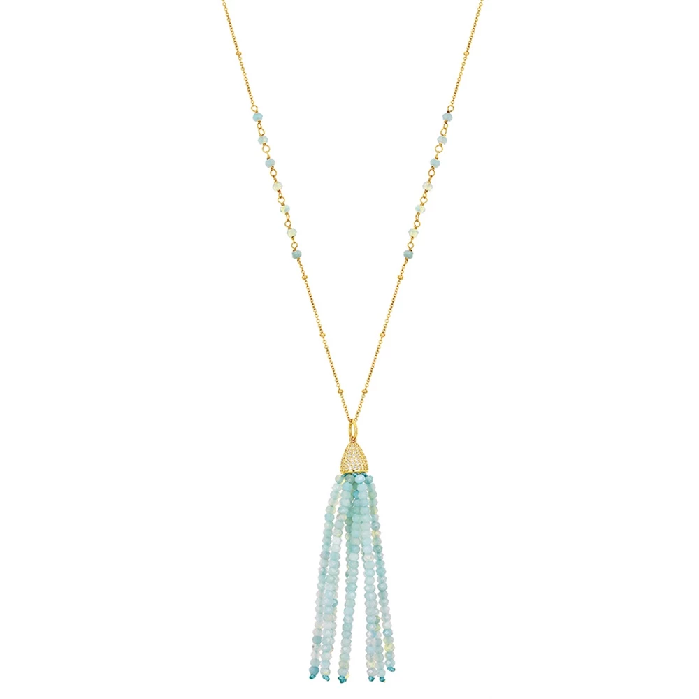 Γυναικείο μακρύ κολιέ VOGUE από επιχρυσωμένο ασήμι 925. Έχει λεπτή αλυσίδα που διακοσμείται με μπλε κρυστάλινες πέτρες και ζιργκόν.