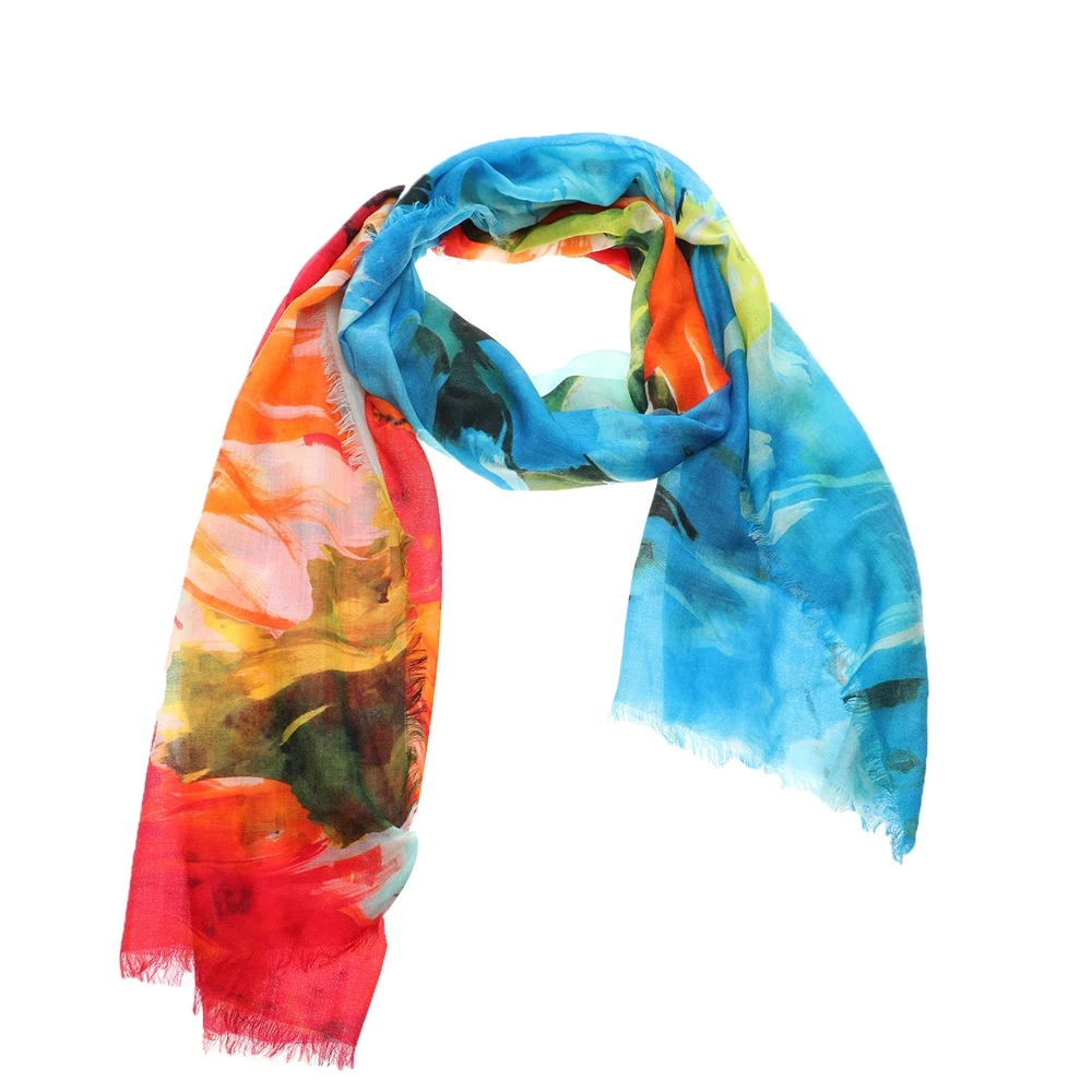 Γυναικείο μαντήλι ECHO SHIBORI σε μπλε και πορτοκαλί απόχρωση, με floral μοτίβα σε ολη την επιφάνεια και κρόσια περιμετρικά στο τελείωμα. Από ανάλαφρη ύφανση για να το τυλίξετε γύρω από το λαιμό και να ολοκληρώσετε την εμφάνισή σας.