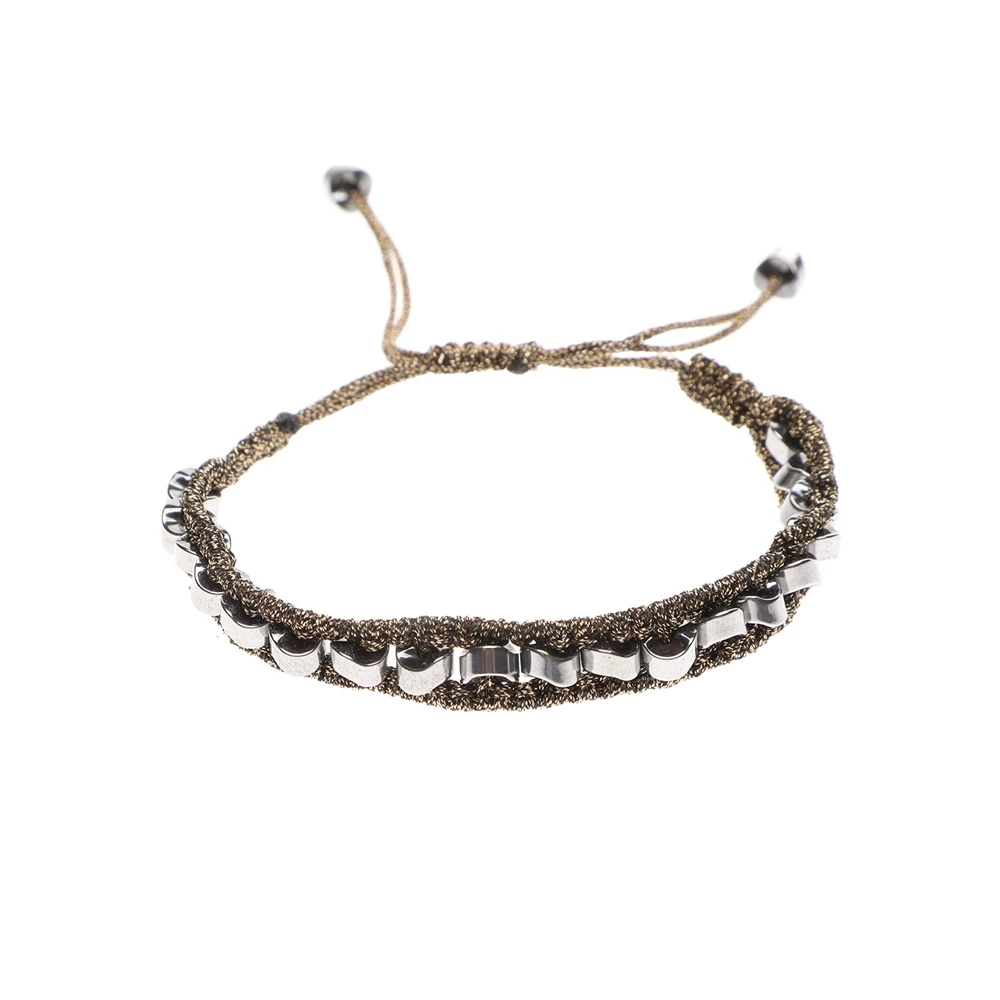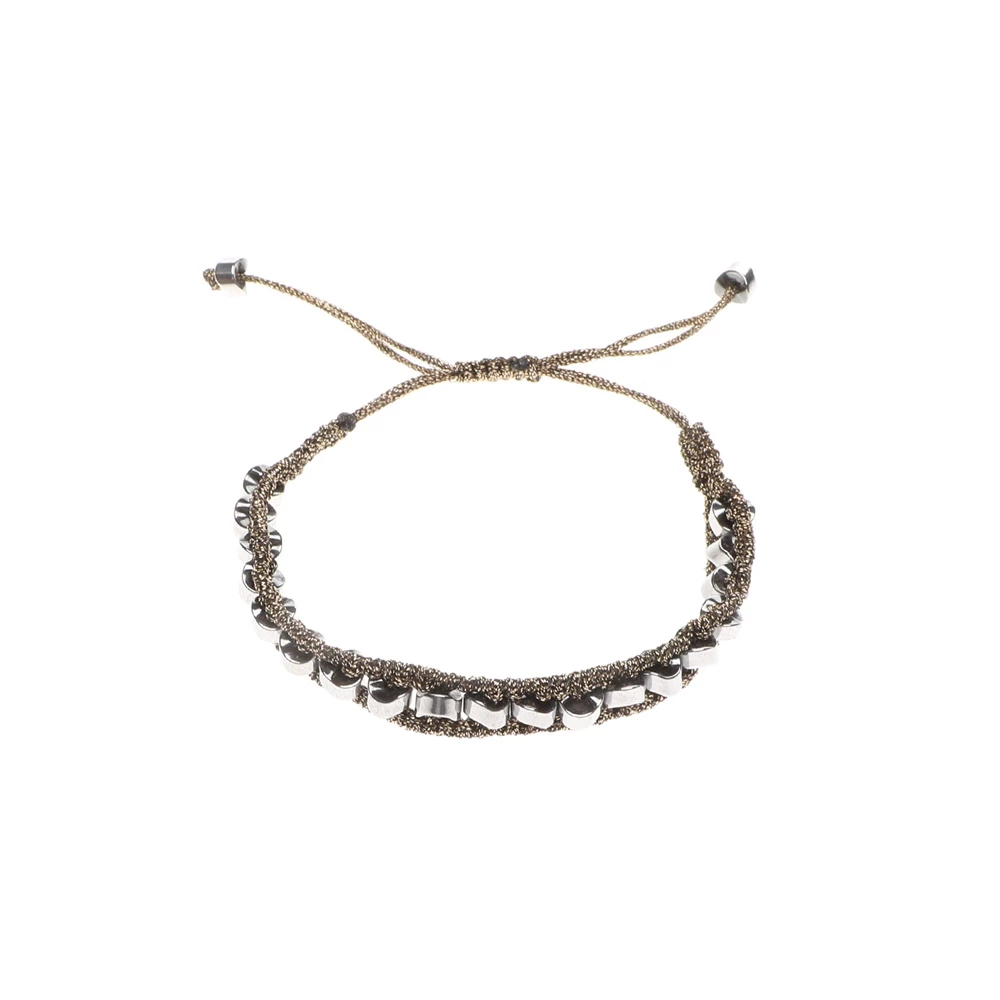 Γυναικείο πλεκτό βραχιόλι ERMINA KASS με ασημί χάντρες από αιματίτη ημιπολύτιμο λίθο, περασμένες σε μεταλλικό βαμβακερό νήμα. Έχει μακραμέ κούμπωμα και αυξομειούμενο μήκος για να εφαρμόζει σε κάθε χέρι.