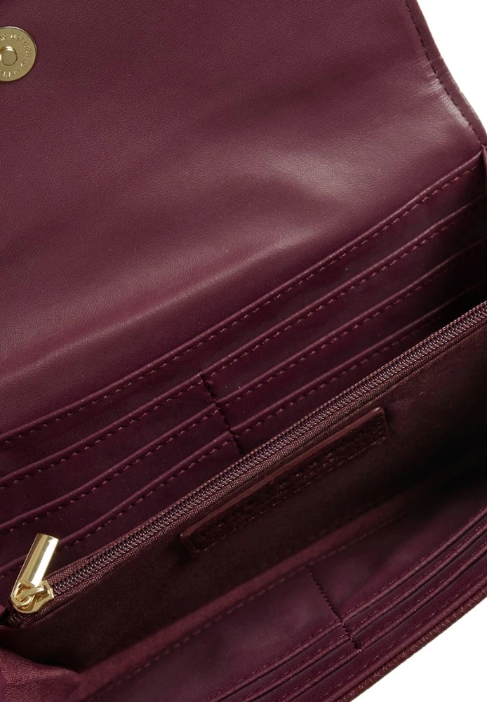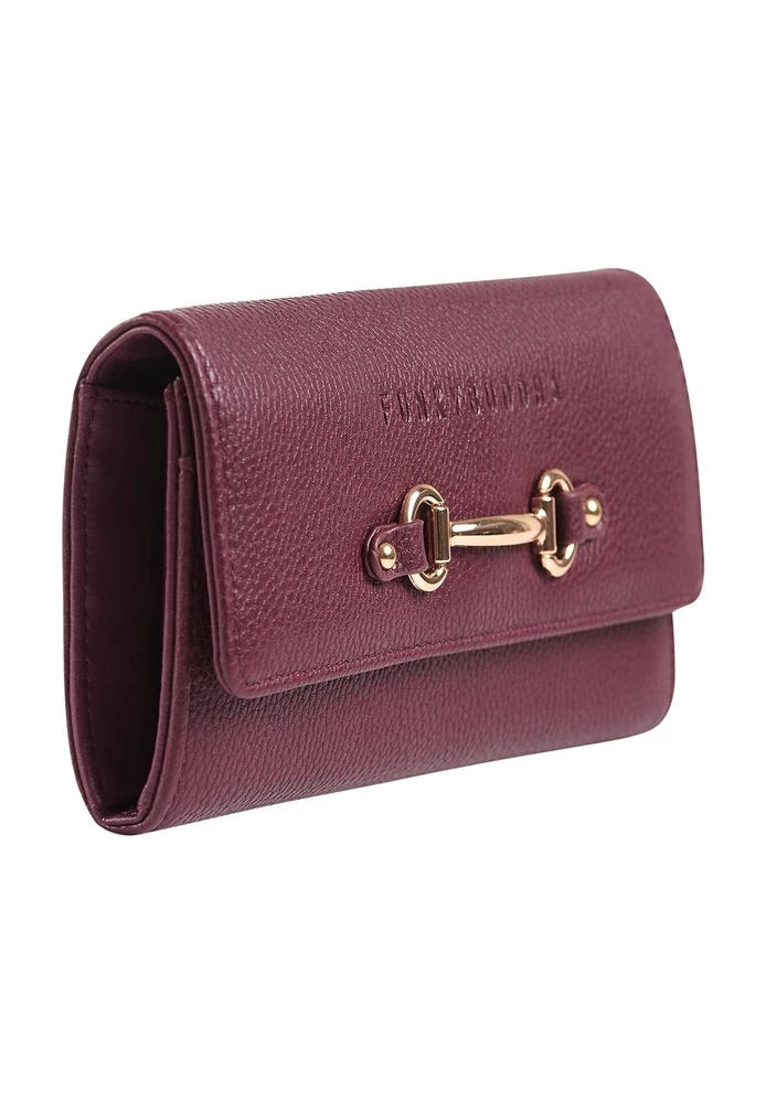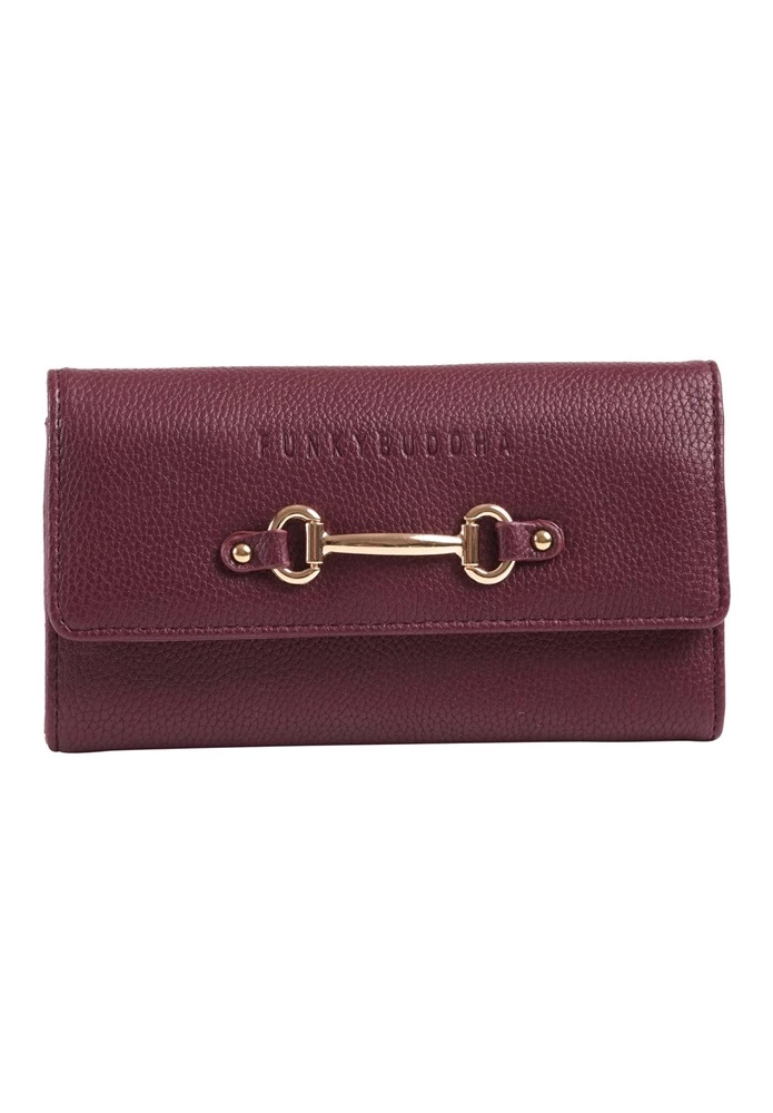 Γυναικείο πορτοφόλι FUNKY BUDDHA σε μοβ απόχρωση. Από συνθετικό δέρμα, με διακοσμητική χρυσή αγκράφα. Διαθέτει εσωτερικά δύο θέσεις για χαρτονομίσματα, μία θήκη για κέρματα που κλείνει με φερμουάρ και πολλαπλές θέσεις για κάρτες. Κλείνει με μαγνητικό κούμπωμα.